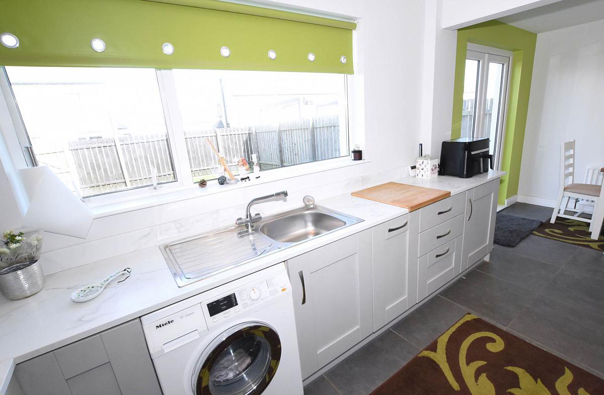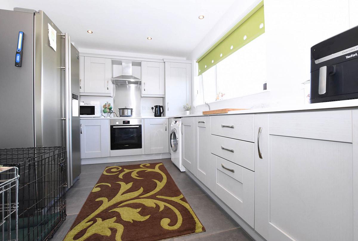 Single drainer stainless steel sink unit with mixer taps. Good range of fitted high and low level kitchen units with roll edged worktops. Four ring electric hob with built in oven and stainless steel extractor fan over. Integrated dishwasher. Plumbed for washing machine. Storage cupboard. Ceramic tiled floor. Double glazed doors to the rear.