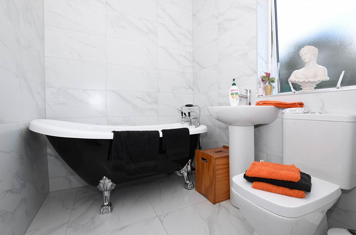 Freestanding bath with clawed feet, mixer taps and telephone hand shower. Pedestal wash hand basin. Low flush w.c. Full wall tilling. Ceramic tiled floor.