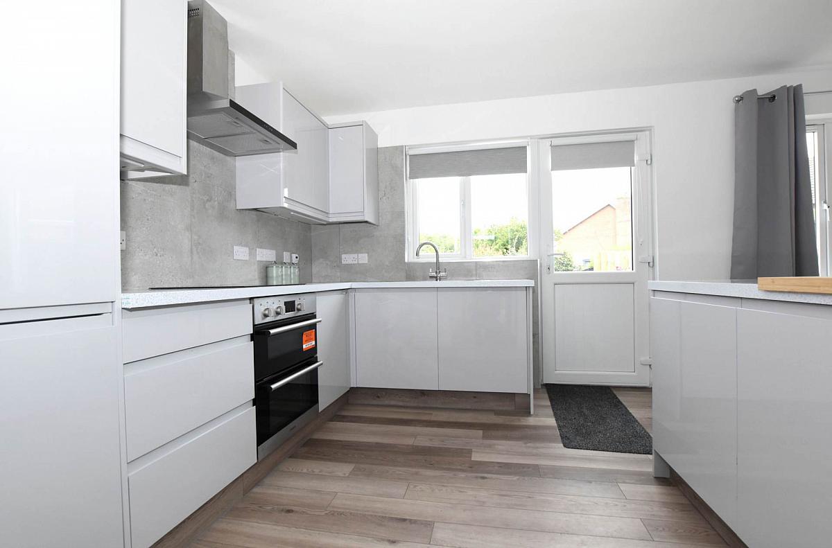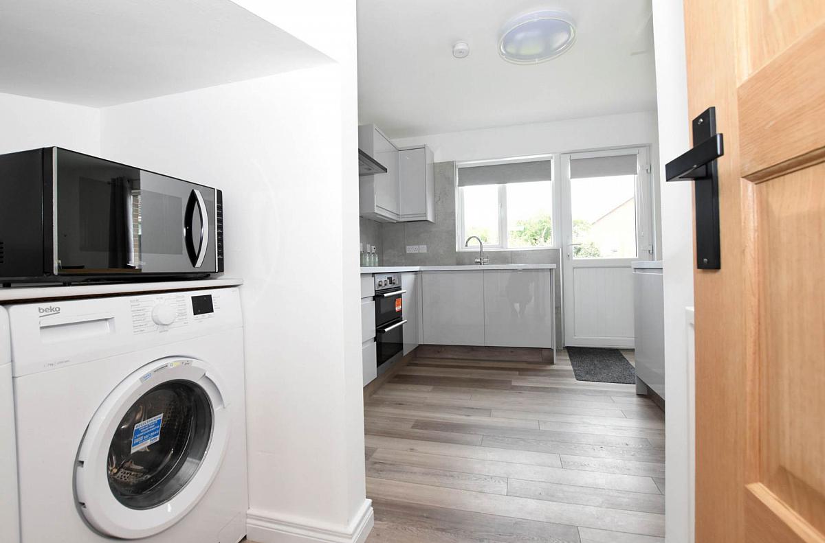 Single drainer stainless steel sink unit with mixer taps. Good range of fitted high and low level kitchen units with laminate work tops and island. Four ring electric hob and built in under oven. Integrated dishwasher and fridge freezer. Plumbing for washing machine.
