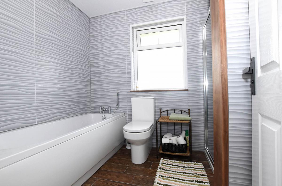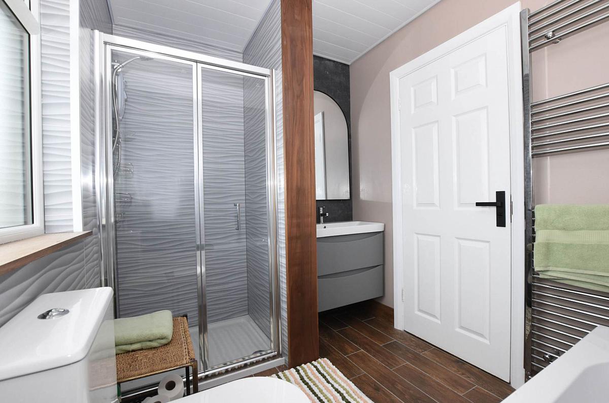 Panel bath with telephone hand shower. Low flush w.c. Vanitory unit. Shower cubicle with electric shower.