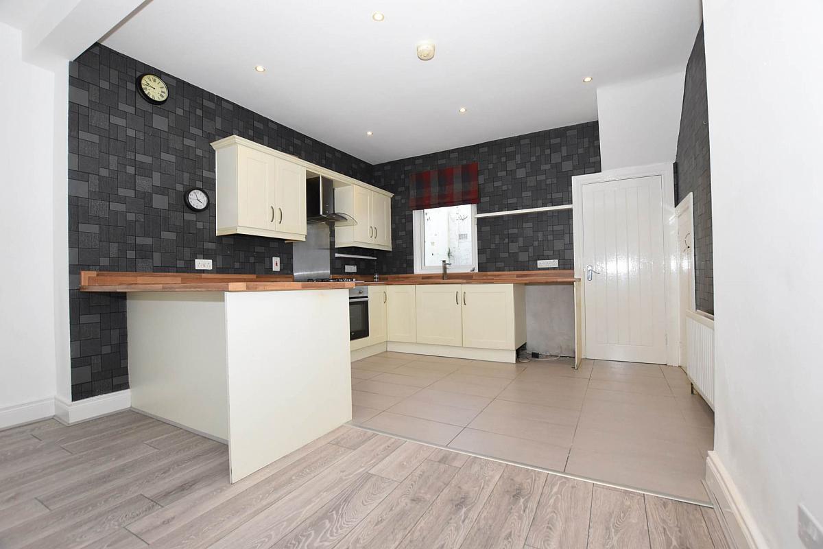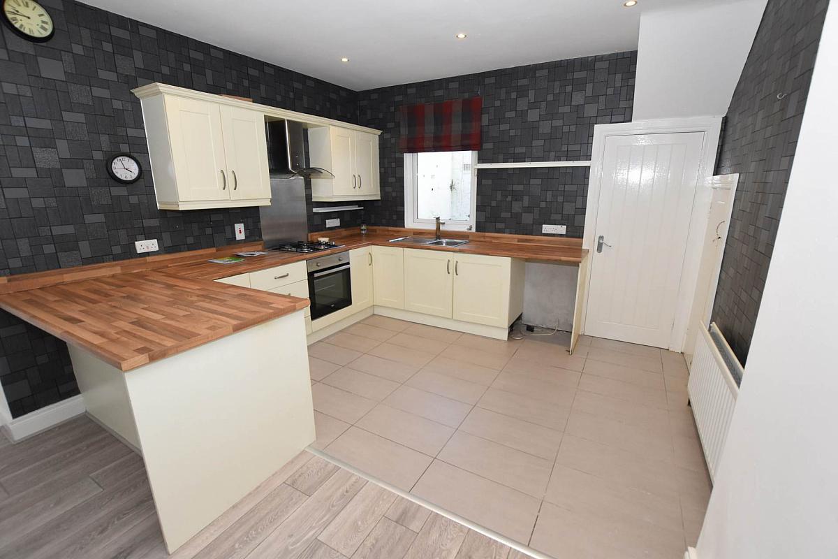 Single drainer stainless steel sink unit. Good range of fitted high and low level kitchen units with roll edged work tops. Four ring gas hob with built in under oven