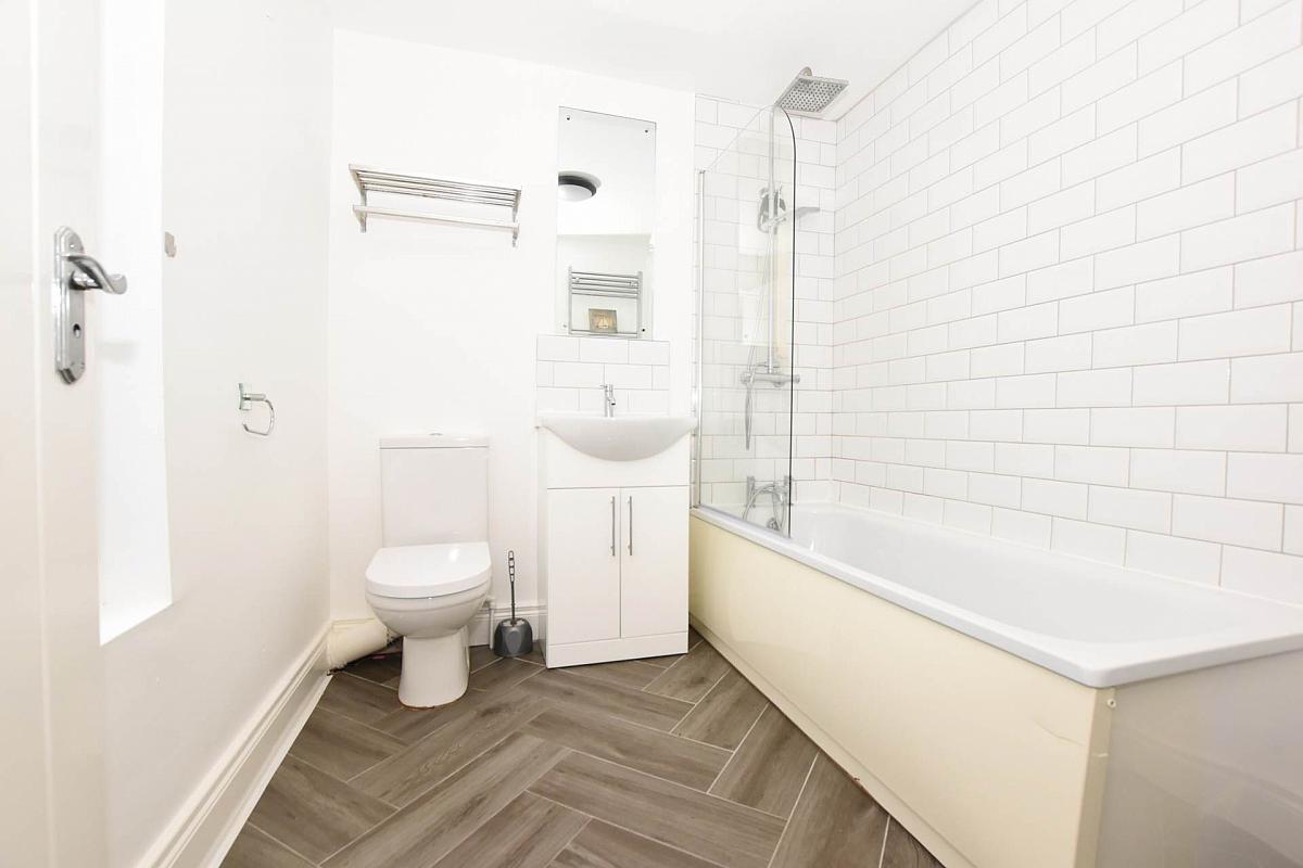 Panel bath with shower over. Vanitory unit. Low flush WC. Part wall tiling.