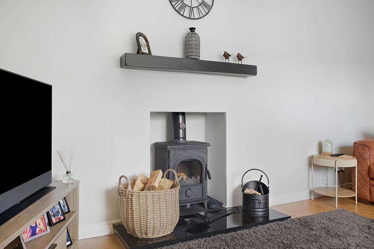 Multi burning stove with tiled hearth. Natural wooden floor,