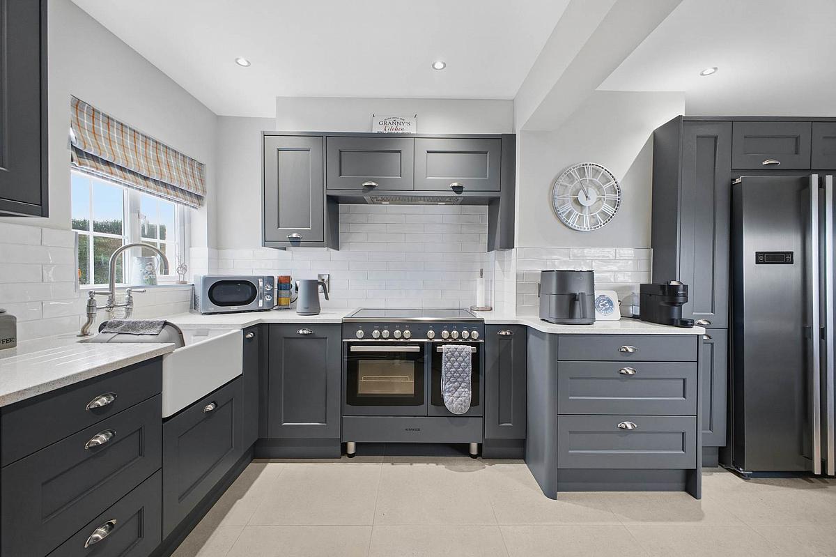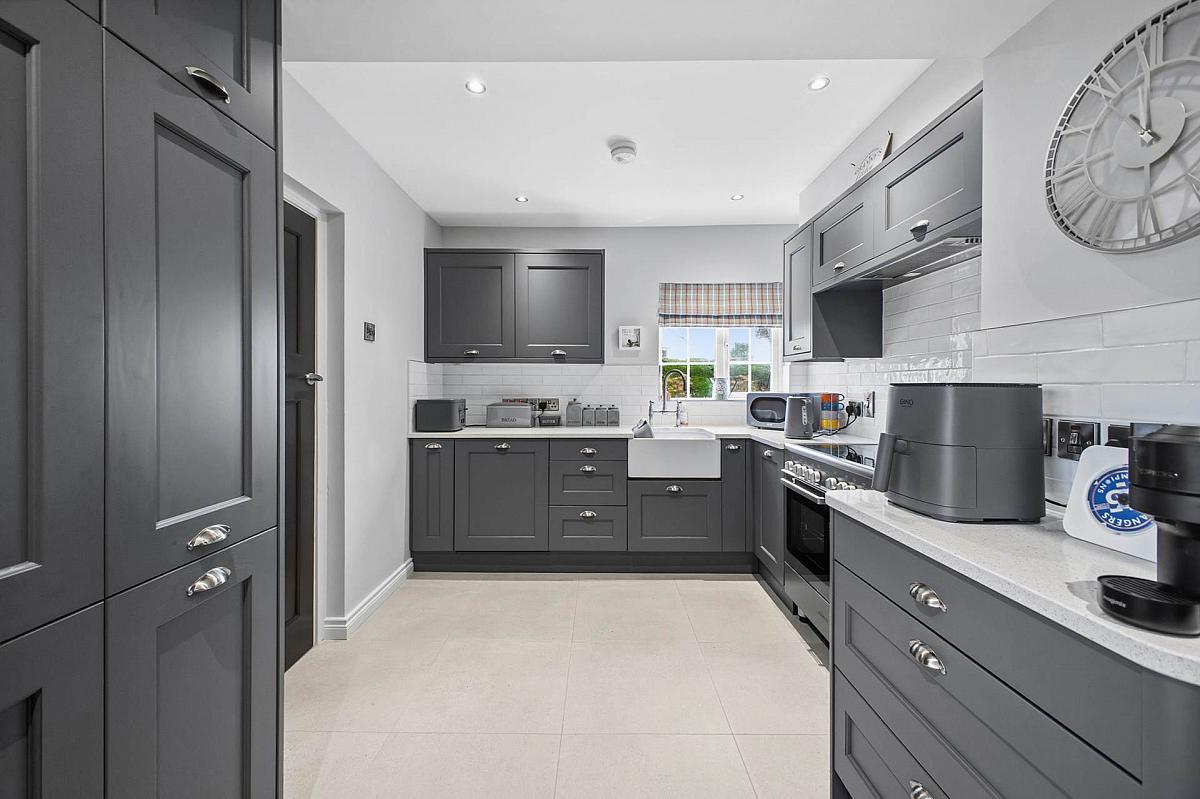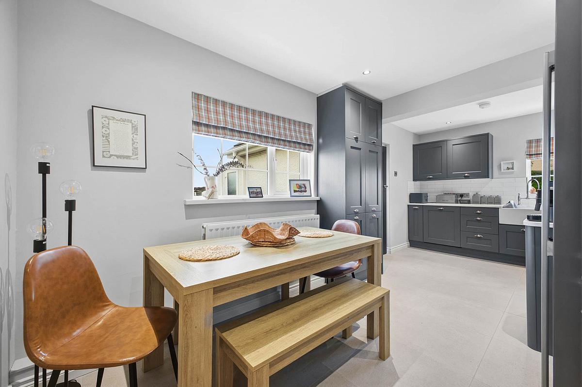 Belfast type sink. Excellent range of fitted high and low level kitchen units with solid work tops. Five ring electric range. Integrated dishwasher. Part wall tiling. Ceramic tiled floor. Dining area.