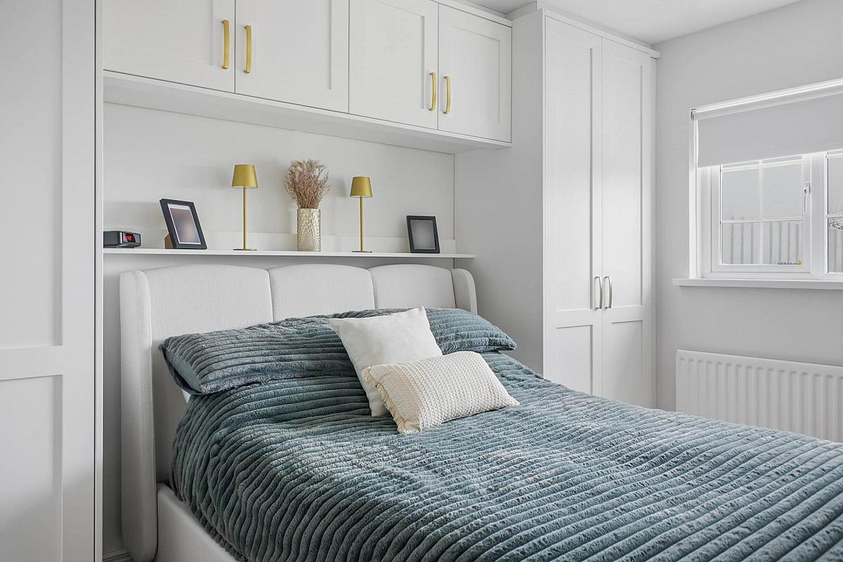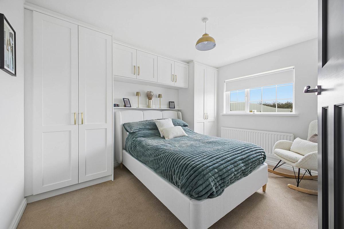 Wall to wall built in bedroom furniture with storage above.