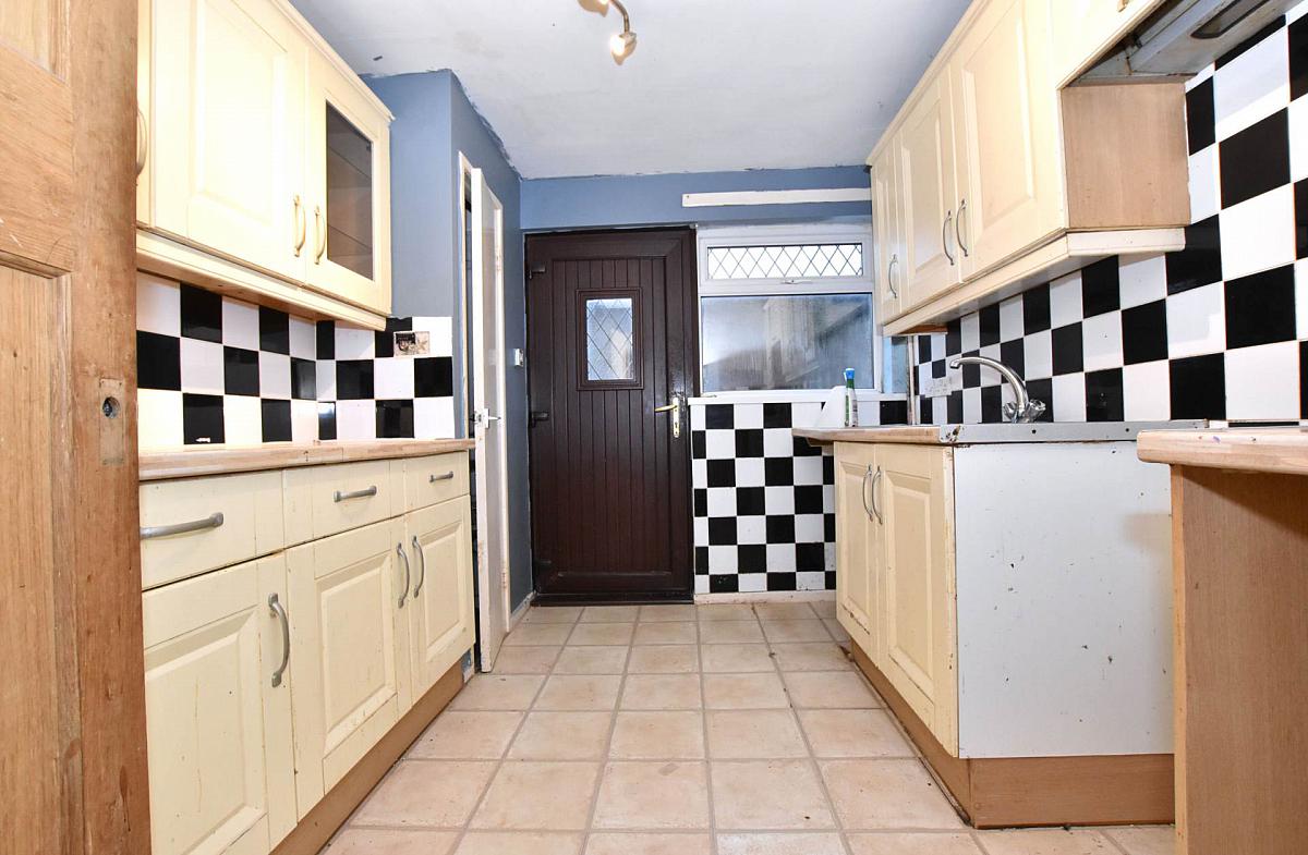 Single drainer stainless steel sink unit. Fitted high and low level kitchen units with roll edged worktops. Larder cupboard. Plumbing for washing machine.