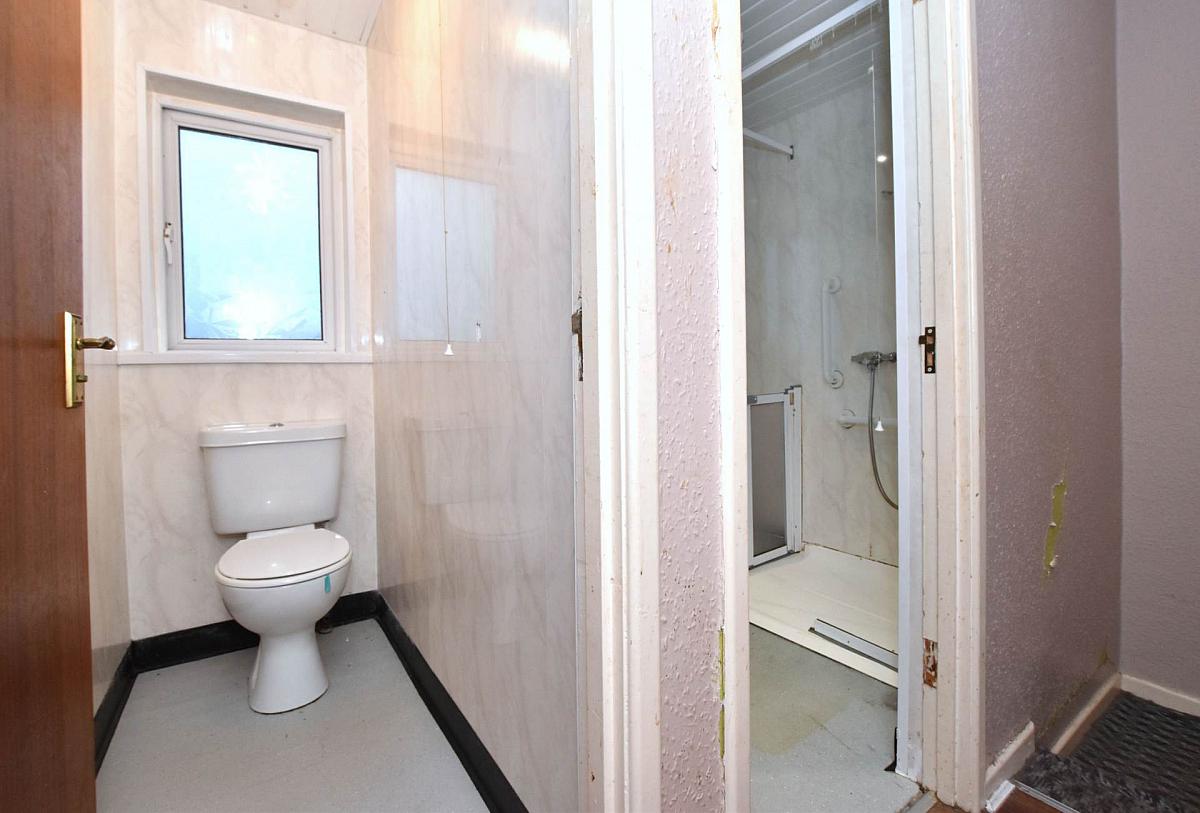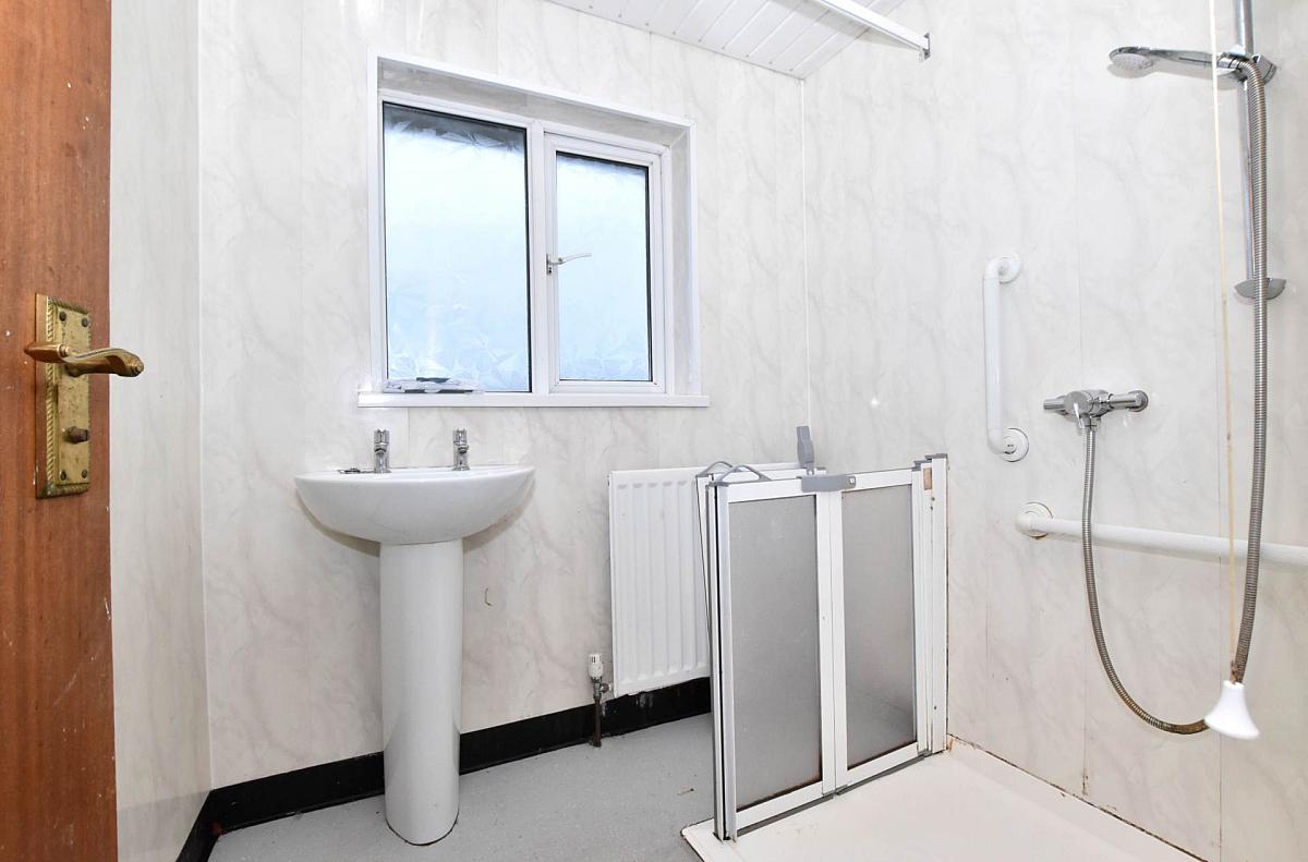 Pedestal wash hand basin. Walk in shower. Panelled walls.