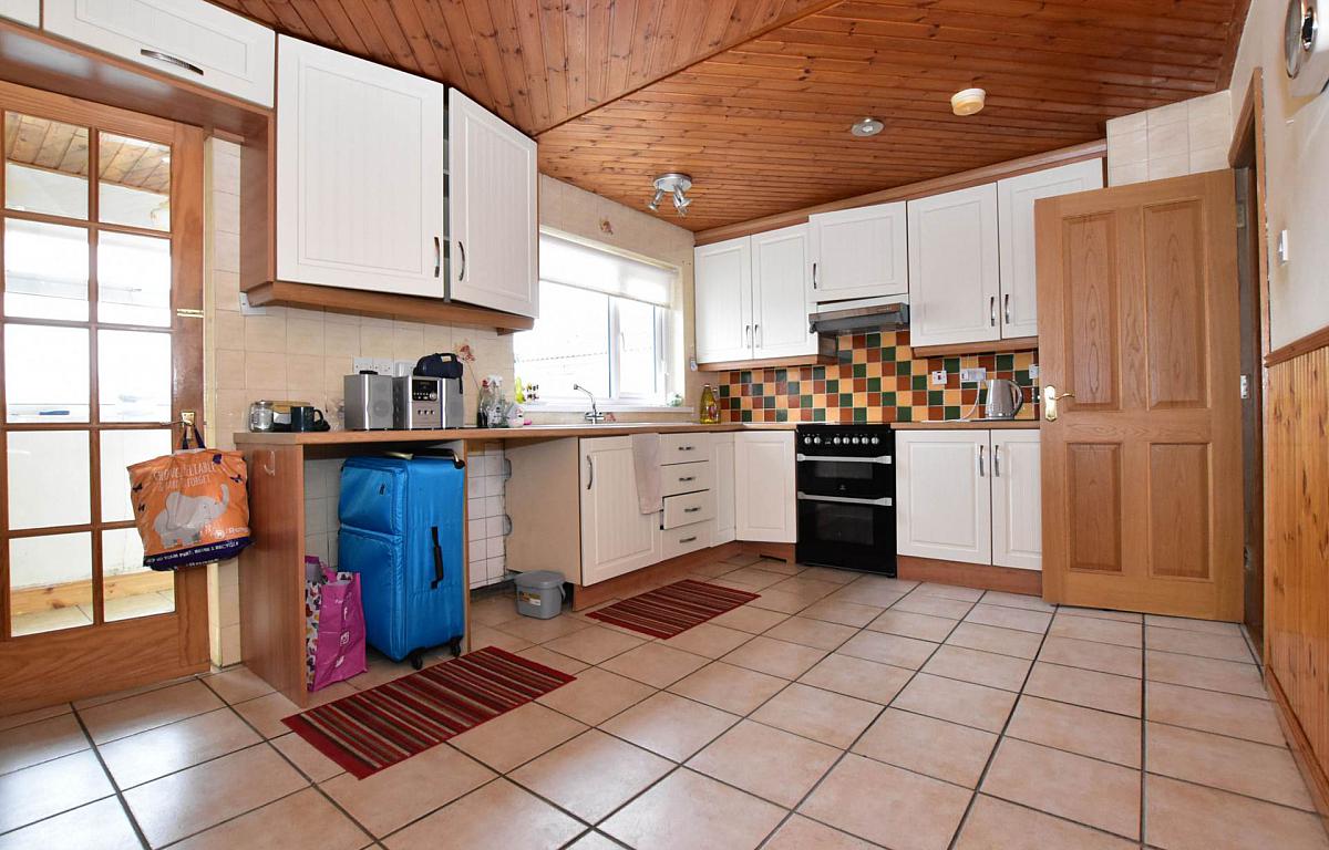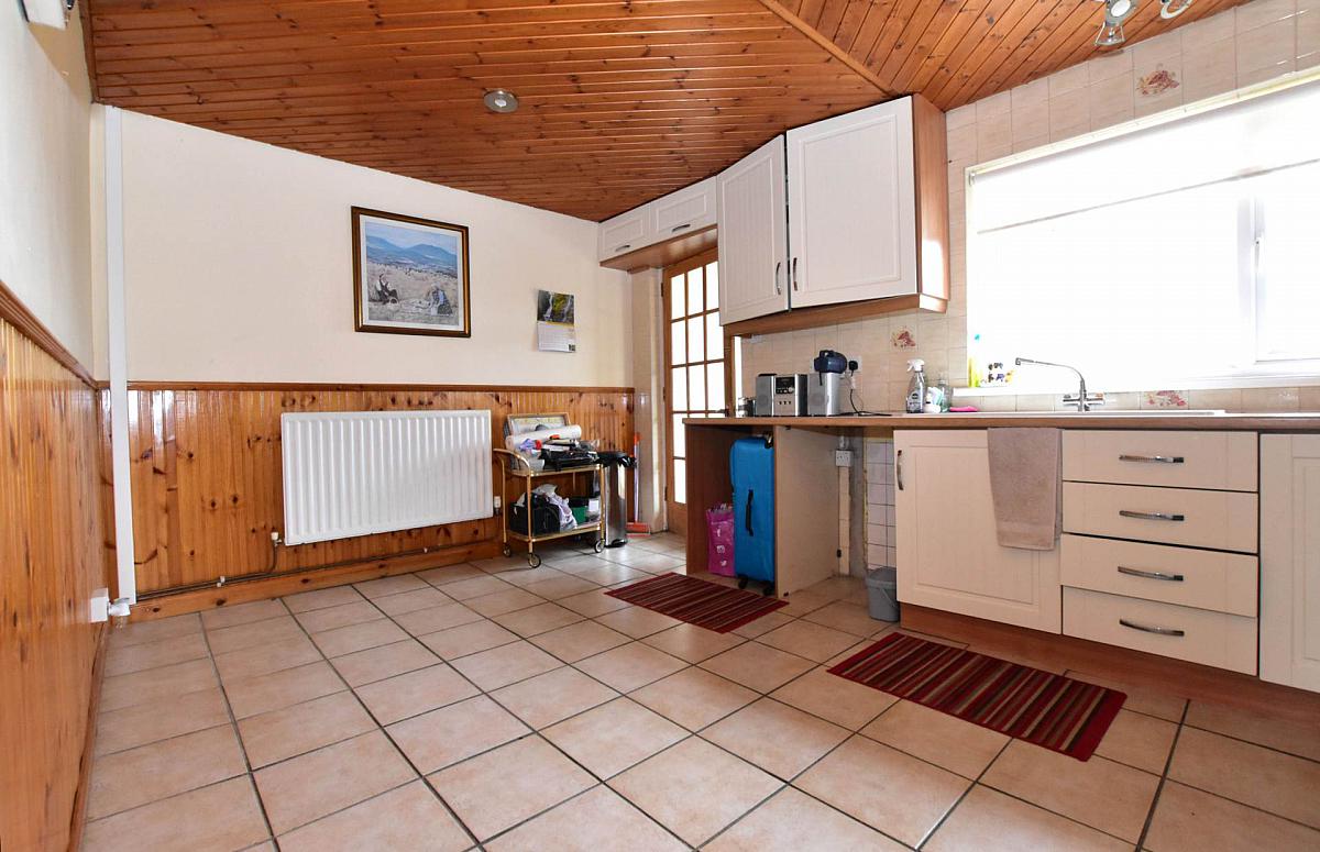 Single drainer sink unit. Range of fitted high and low level kitchen units with roll edged work tops. Part wall tiling. Ceramic tiled floor. Pine T & G ceiling.