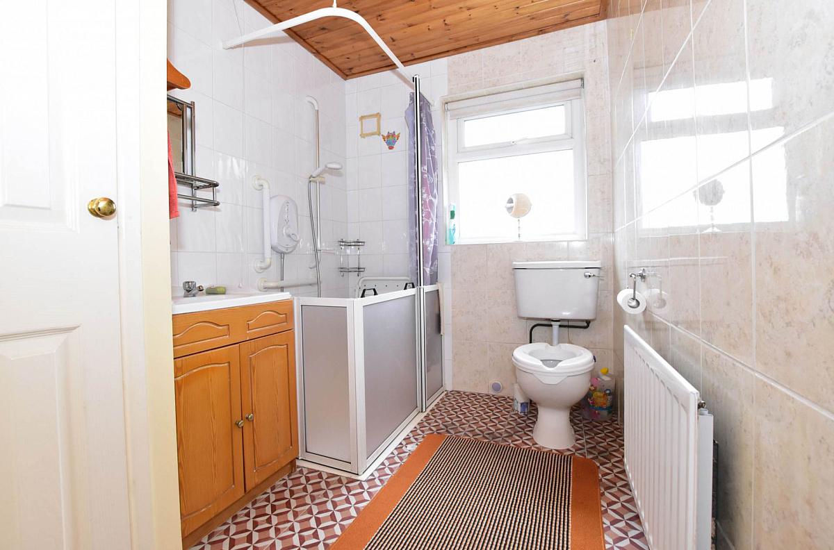 Vanitory unit. Shower cubicle with electric shower. Low flush w.c. Full wall tiling. Hotpress.