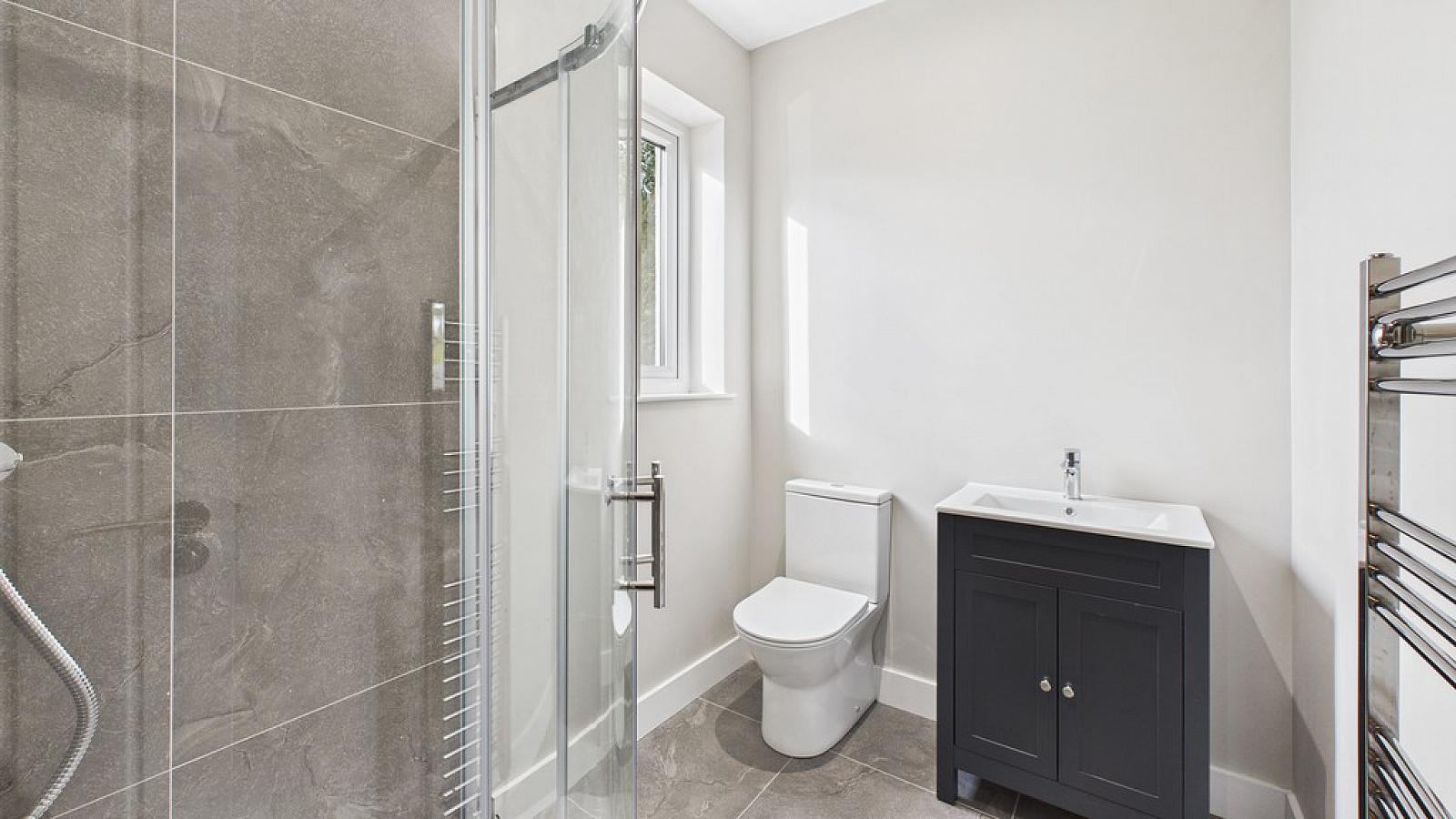 NEW SHOWER ROOM Suite comprising corner shower cubicle with thermostatic shower; dual flush WC; vanity sink unit; tile floor; heated towel rail.