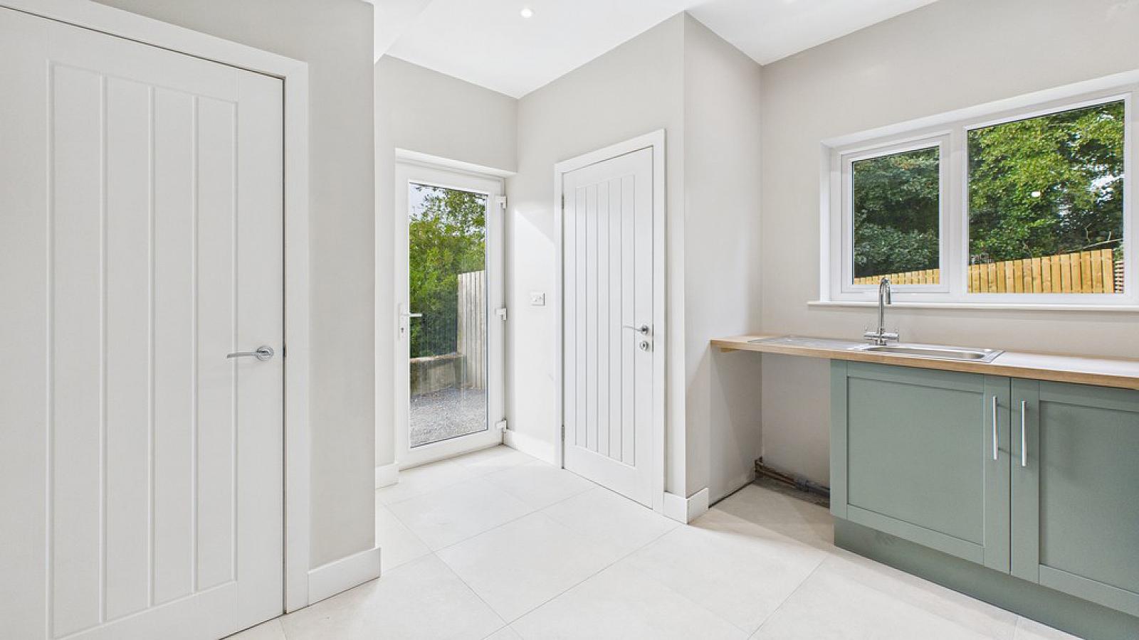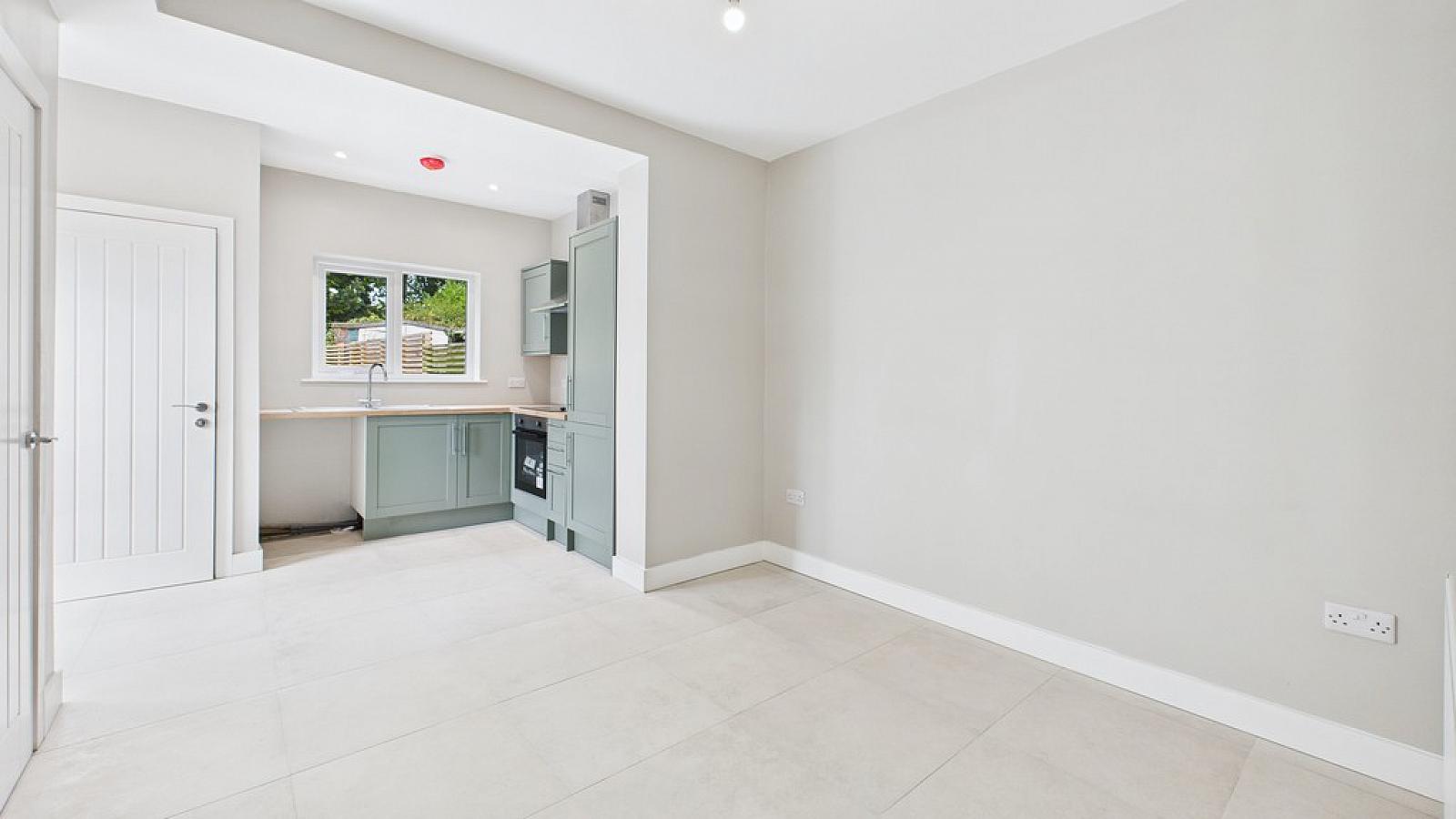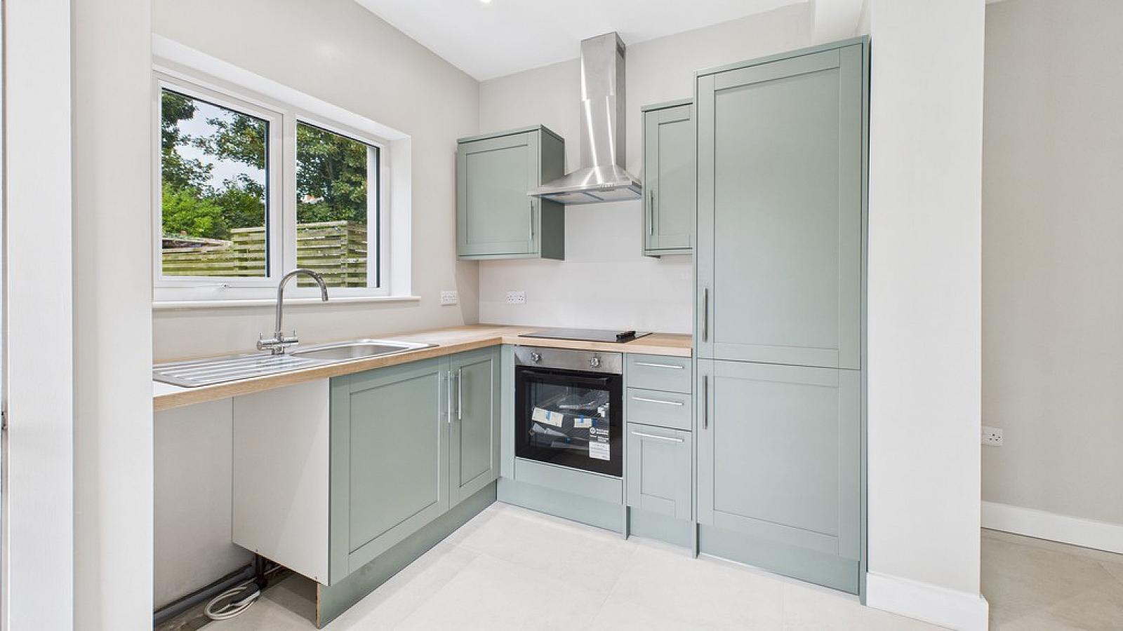 NEW KITCHEN 12' 0" x 7' 4" (3.66m x 2.24m) New fitted kitchen with range of high and low level units, drawers and complementary work surfaces; four ring electric hob and under oven; sink unit and side drainer; integrated fridge / freezer; plumbed for washing machine; tile floor; access to driveway and rear garden.