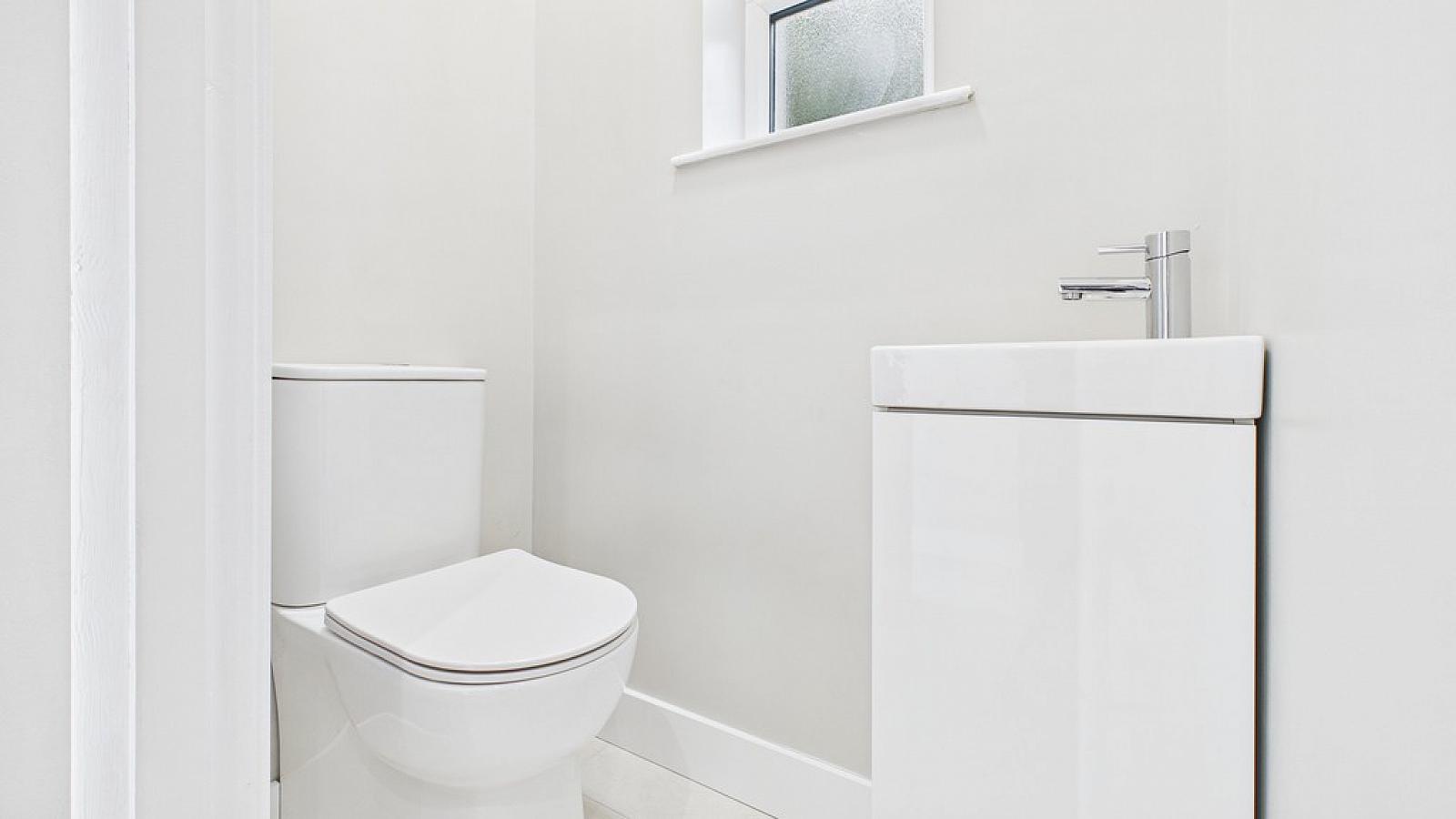 CLOAK ROOM Suite comprising dual flush WC; vanity sink unit; tile floor.