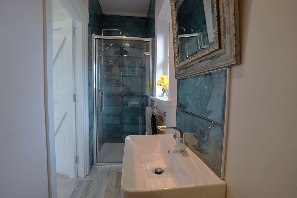 Contemporary bathroom suite comprising of low flush WC and pedestal wash hand basin. Large walk in shower cubicle with overhead rain head shower. Partly tiled . Wood effect flooring.