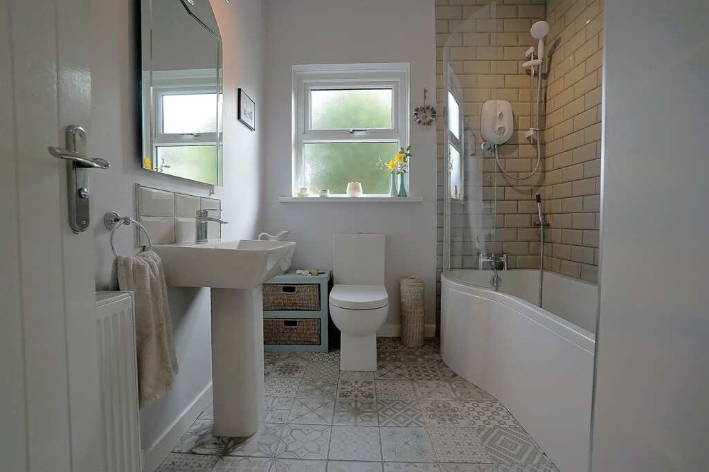 Contemporary bathroom suite comprising of low flush WC and pedestal wash hand basin. Curved paneled bath with overhead shower. Partly tiled walls. Mosaic tiled effect flooring.