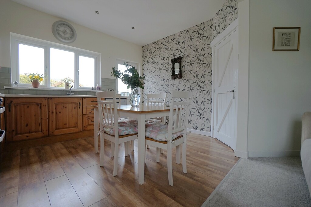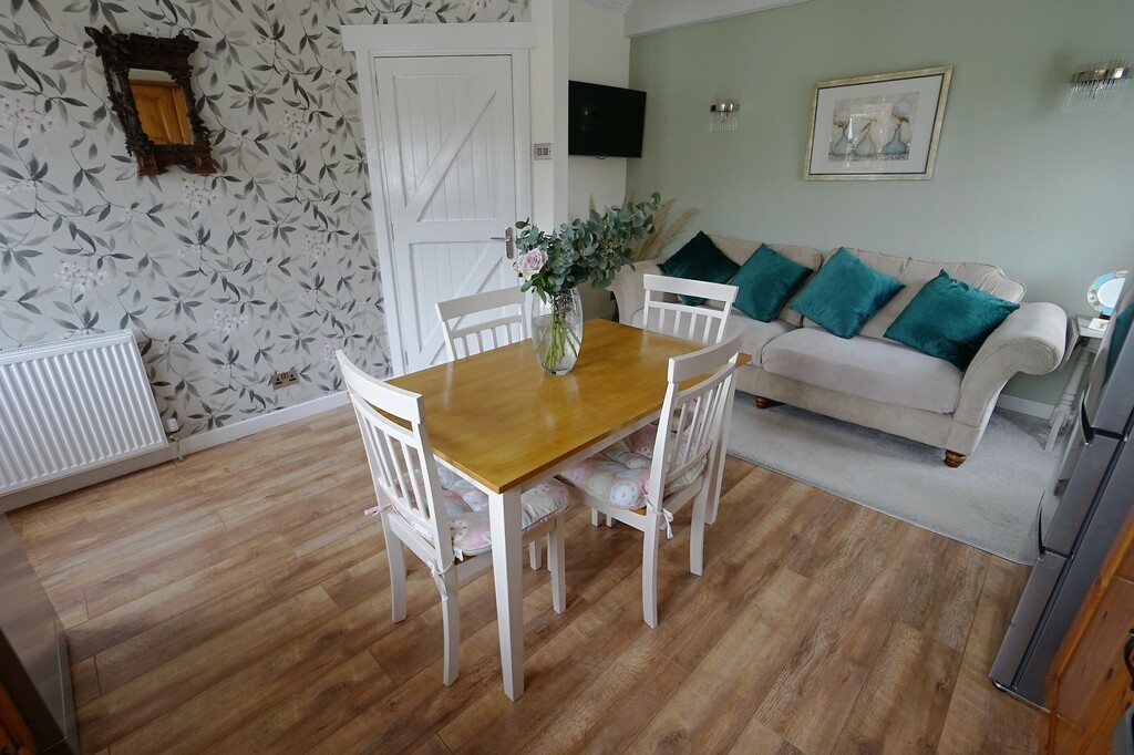Ample range of high and low level solid oak units. Plumbed for white goods. Partly tiled walls. Wood effect flooring. Access to rear.