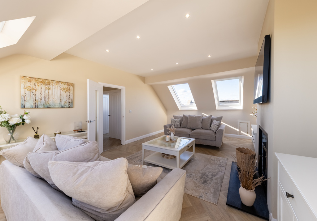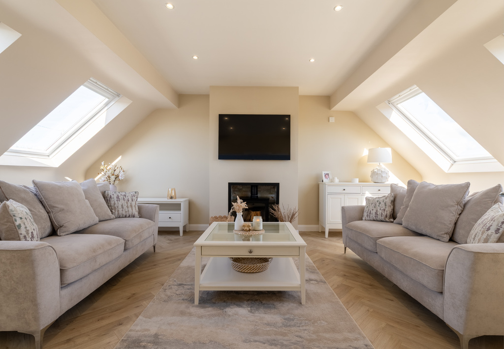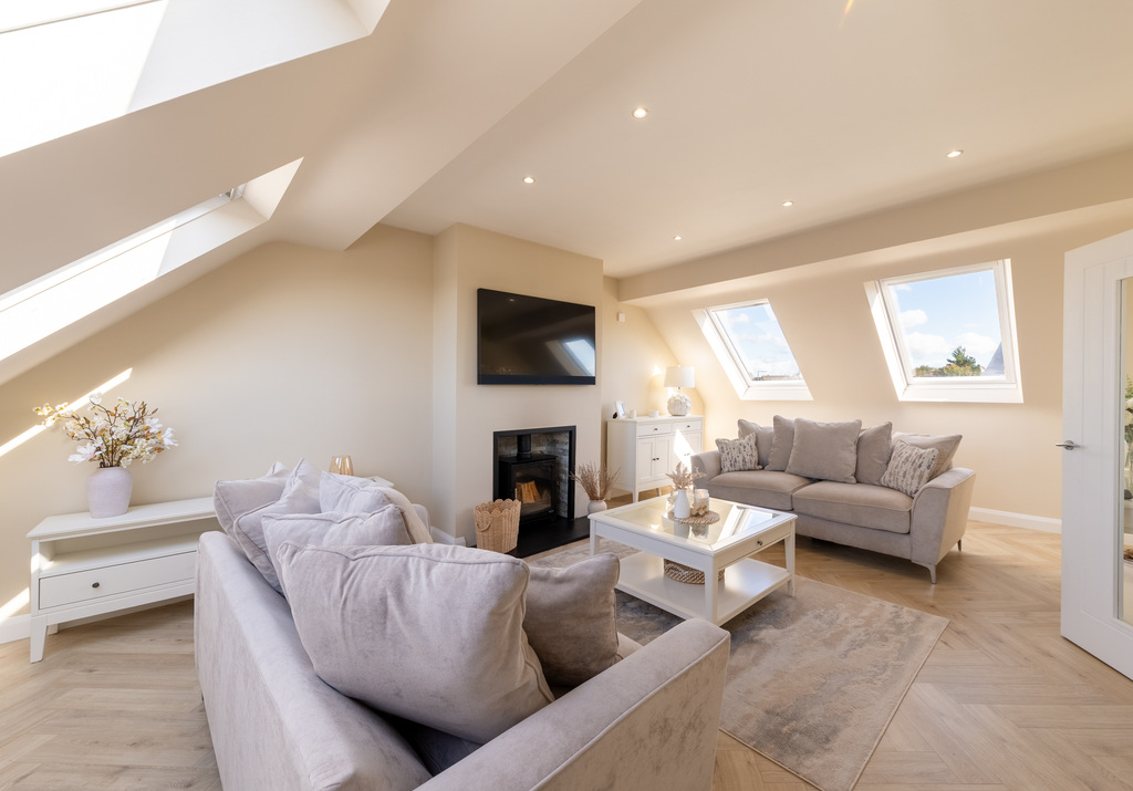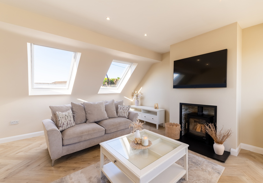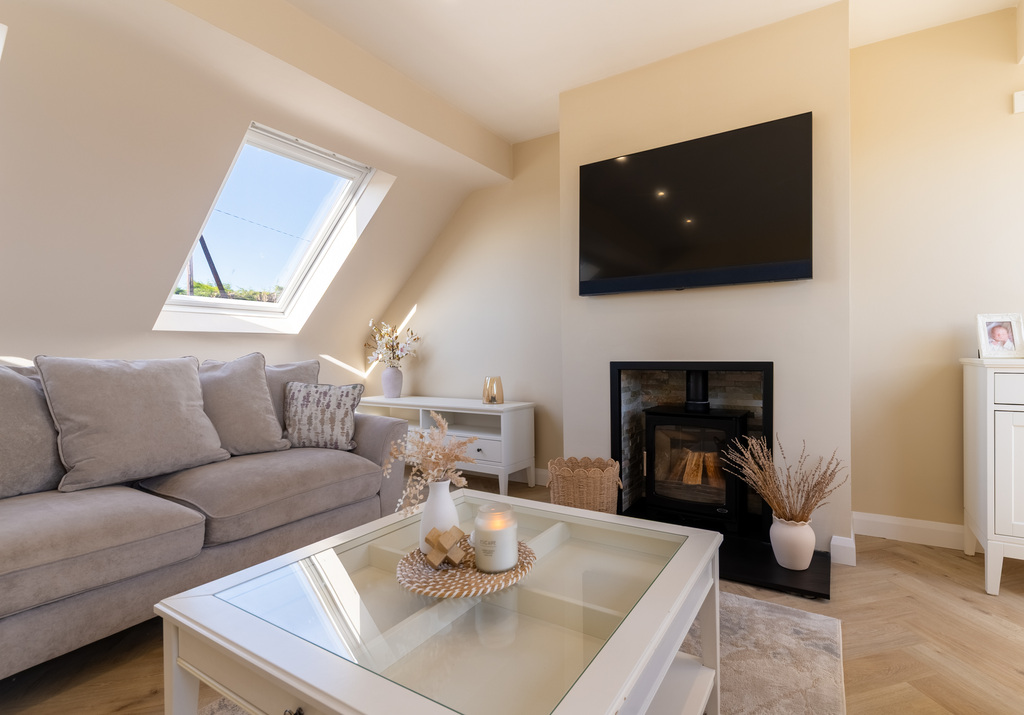 Spacious and Stylish Upstairs Lounge with Feature Wood Burning Stove and Vaulted Ceilings