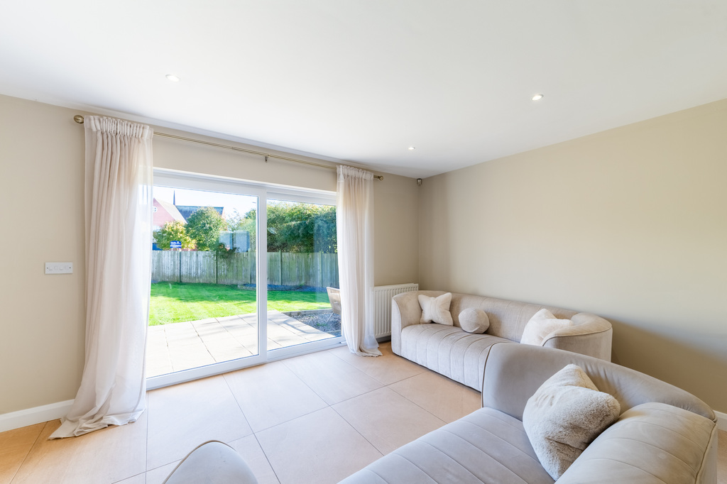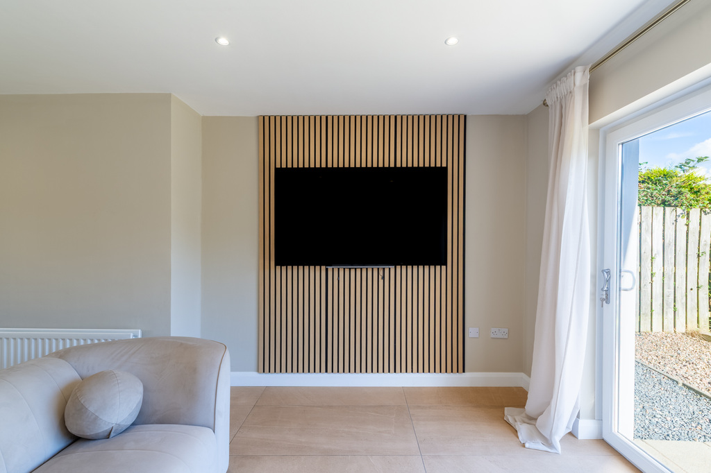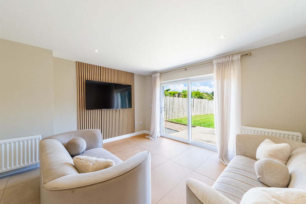 Family/Living Room with Feature Wood Panelled Wall and Patio Doors to Rear Garden