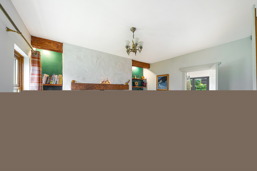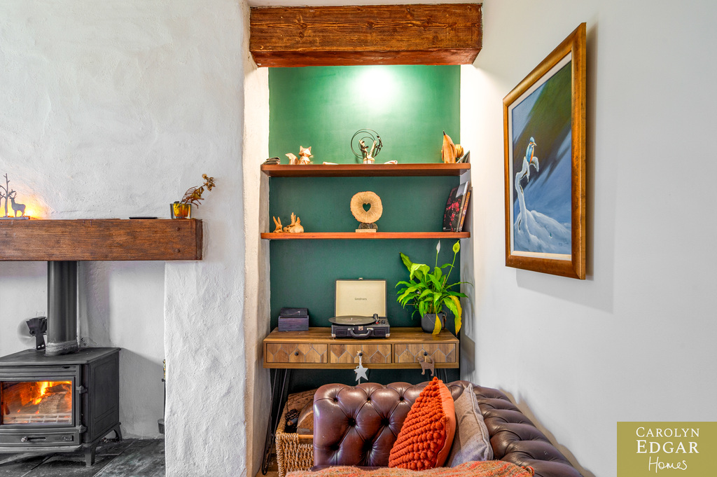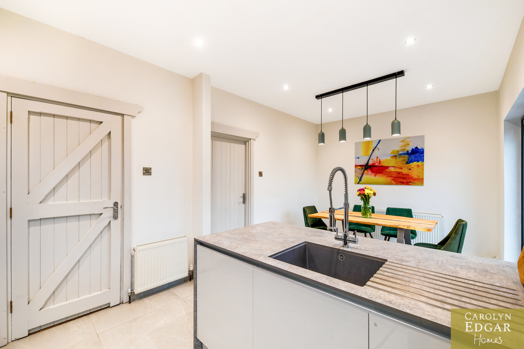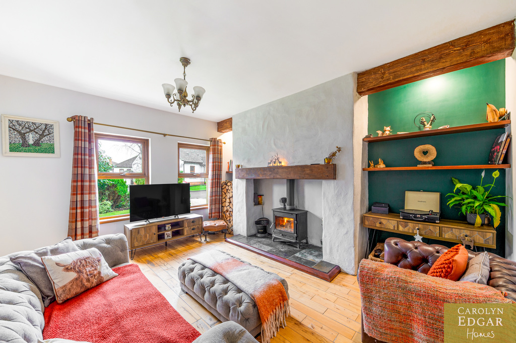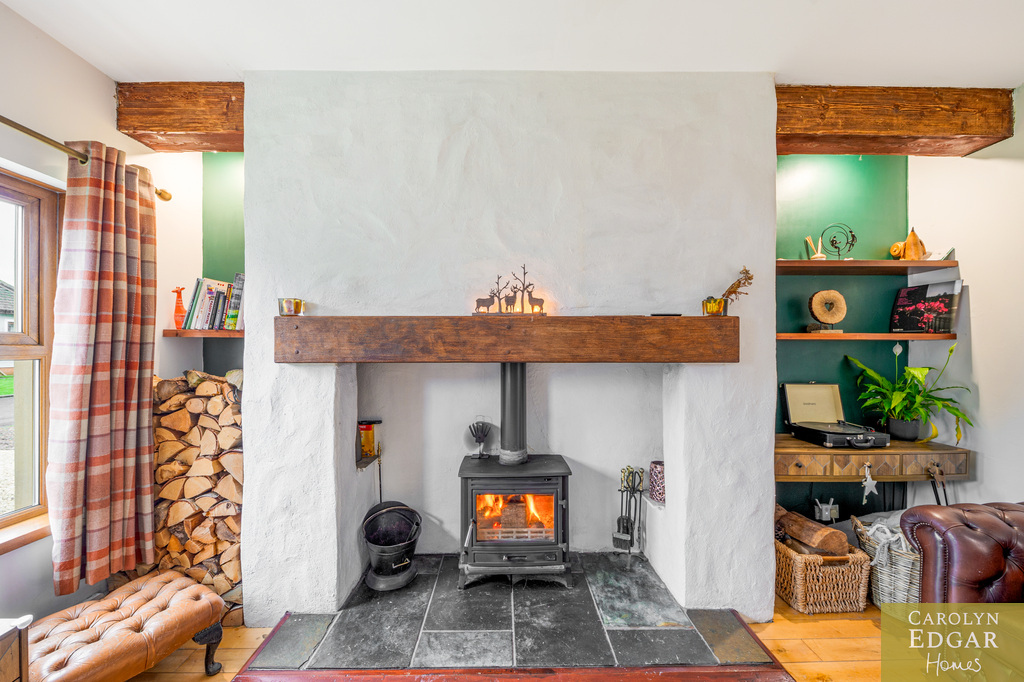 Internally, the accommodation comprises a welcoming entrance hallway with decorative panelling, leading to a spacious yet delightfully cosy lounge featuring a delightful, white-washed ingle nook fireplace with wood-burning stove and charming built-in log store. The contemporary open-plan kitchen, dining and entertaining space has been thoughtfully opened up by the current owners and finished to a modern standard with an ample range of built in units, modern appliances, centre island and bi-fold doors opening onto the decked sun terrace perfect for indoor-outdoor living.