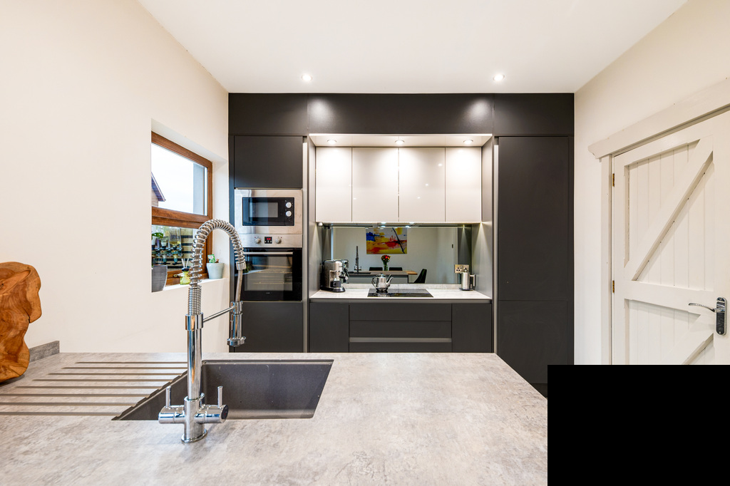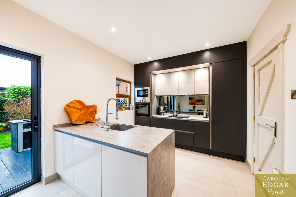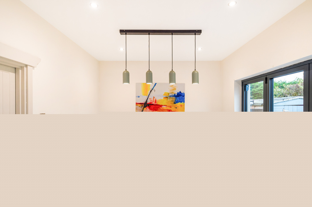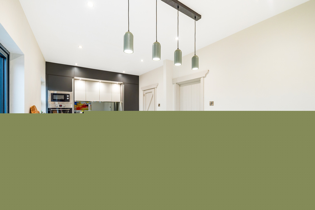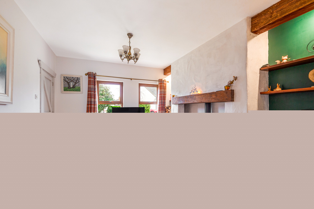 Internally, the accommodation comprises a welcoming entrance hallway with decorative panelling, leading to a spacious yet delightfully cosy lounge featuring a delightful, white-washed ingle nook fireplace with wood-burning stove and charming built-in log store. The contemporary open-plan kitchen, dining and entertaining space has been thoughtfully opened up by the current owners and finished to a modern standard with an ample range of built in units, modern appliances, centre island and bi-fold doors opening onto the decked sun terrace perfect for indoor-outdoor living.