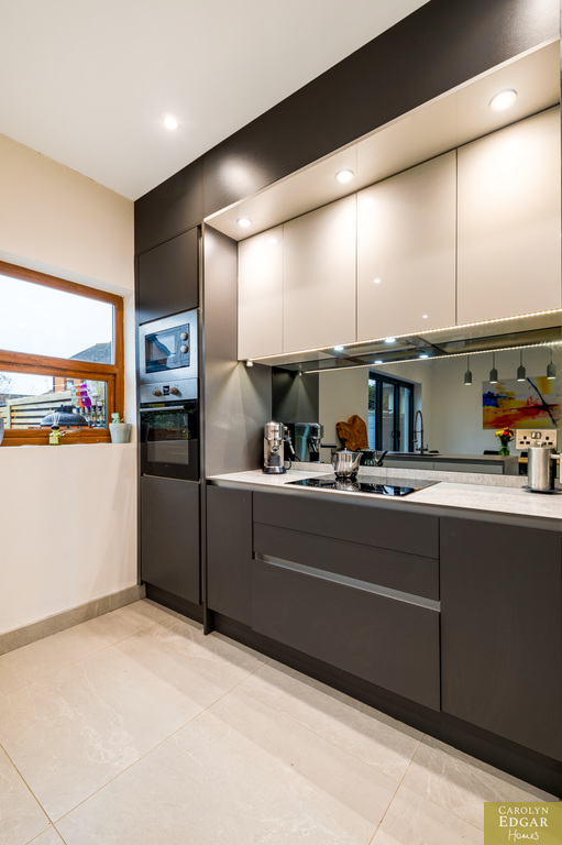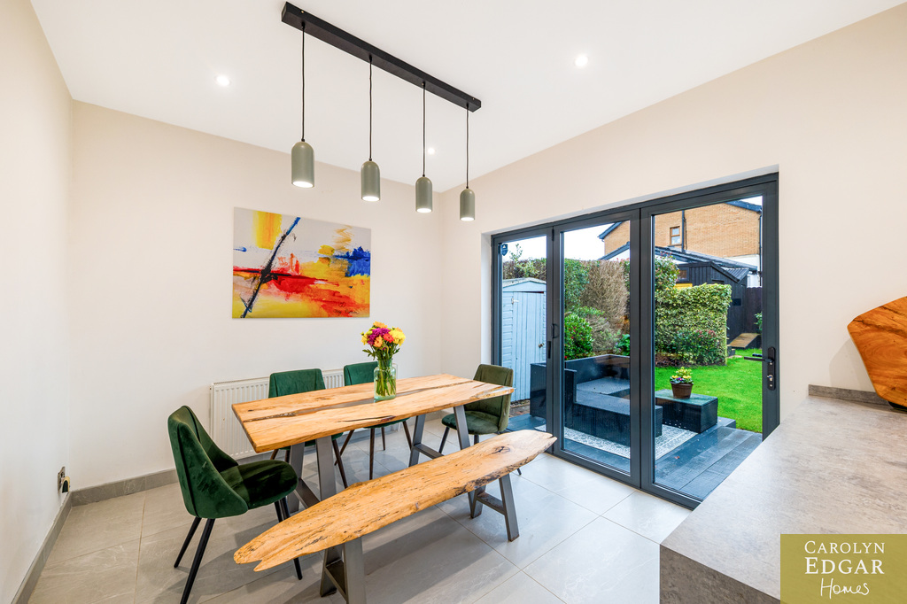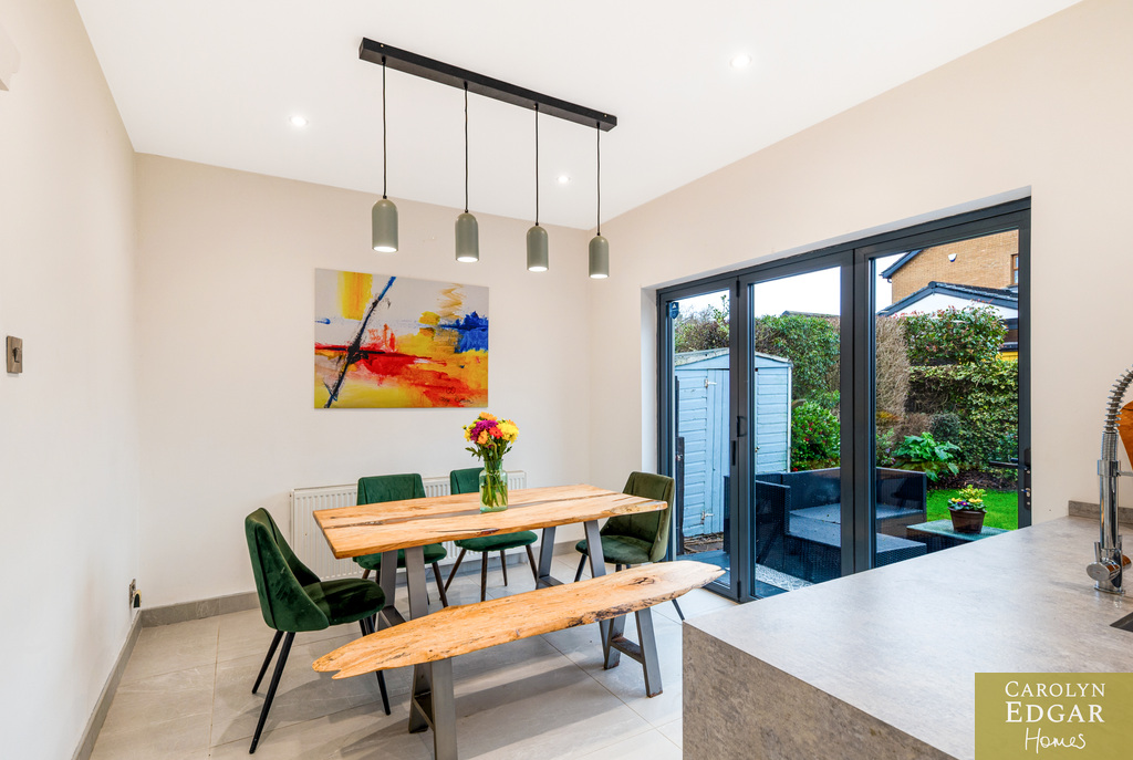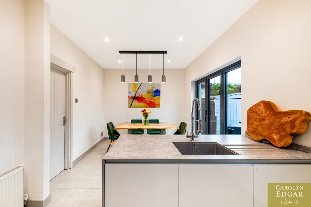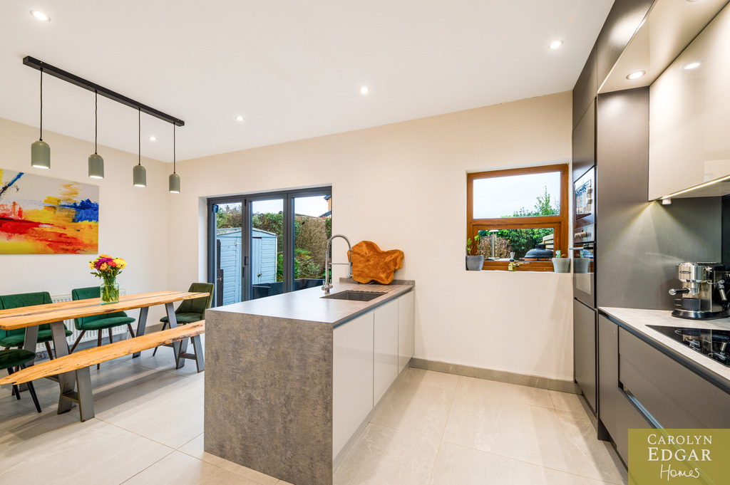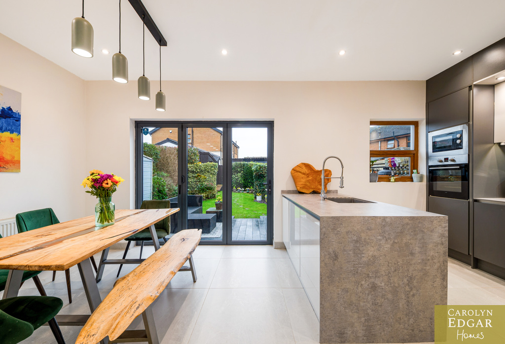 Contemporary Open Plan Kitchen and Dining with Bi Fold Doors Leading to Decked Sun Terrace