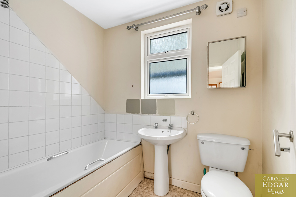 Three piece white suite comprising bath with shower over. Semi pedestal wash hand basin & close couple w.c. uPVC double glazed privacy window, walls partly tiled, extractor fan. Vinyl flooring.