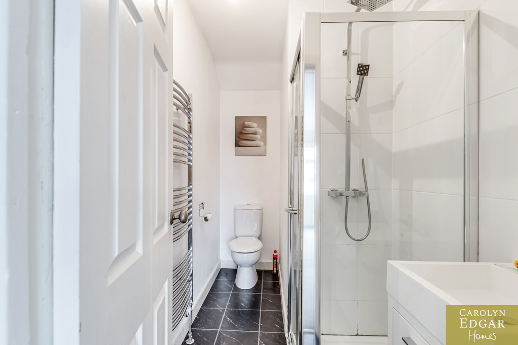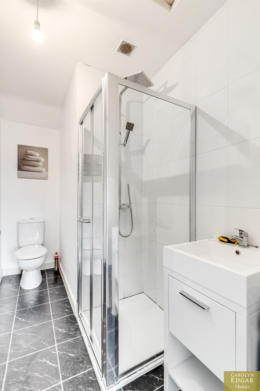 White bathroom suite with rainfall shower, semi pedestal wash hand basin andWC. Ceramic tiled flooring and part tiled walls,