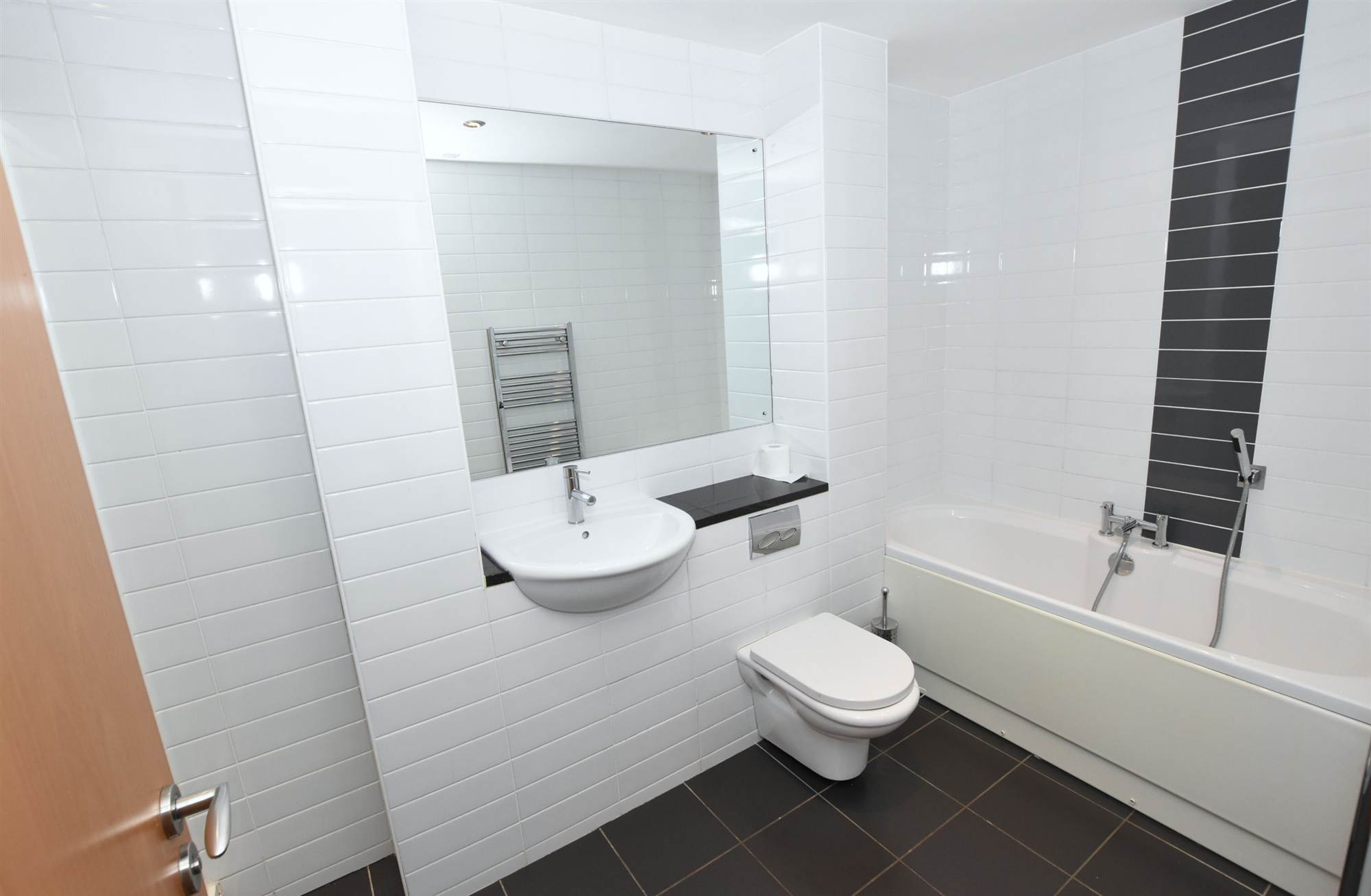 Deluxe white bathroom suite with ceramic wall and floor tiling.