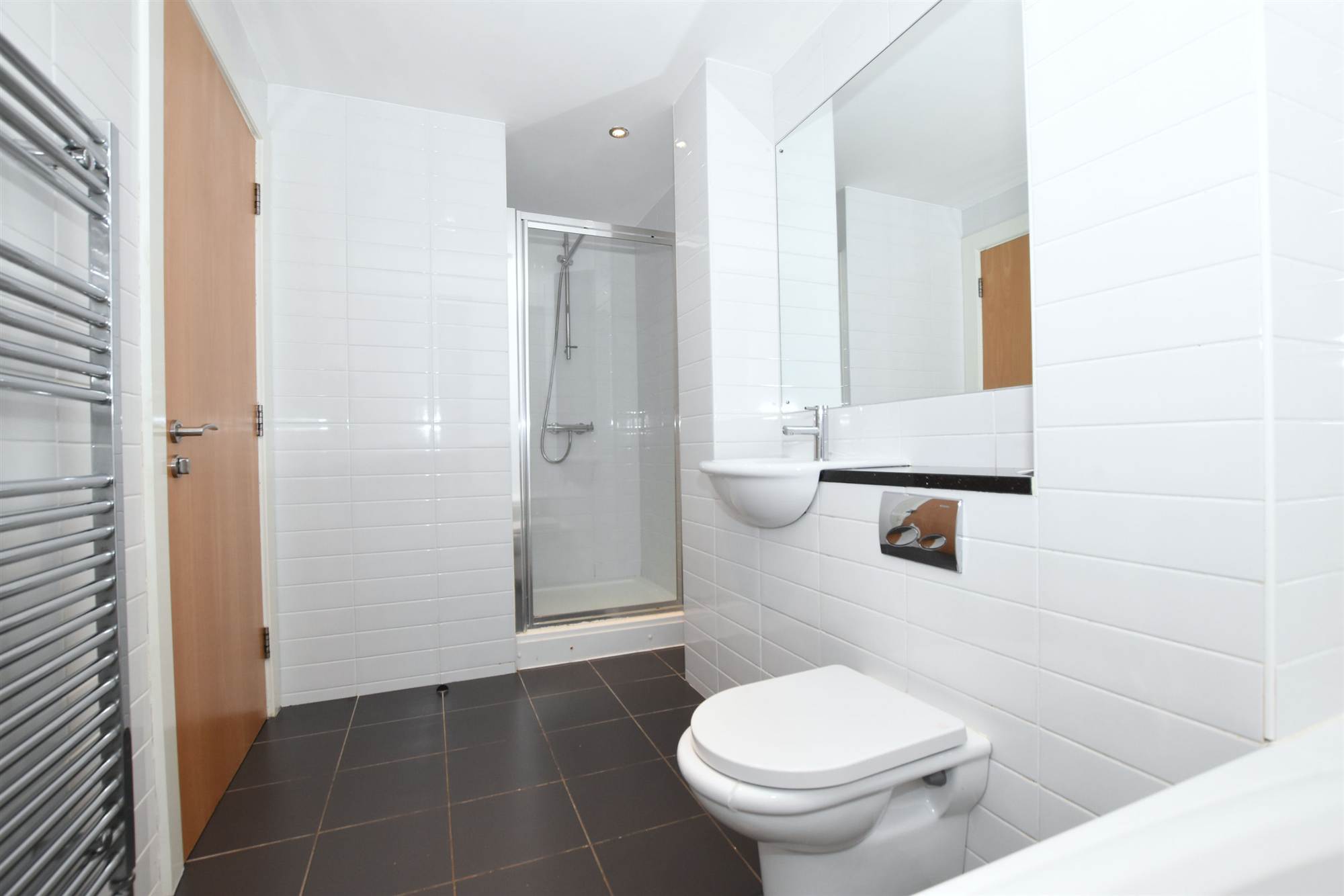 shower, fully tiled shower cubicle, wash hand basin, low flush WC, wall tiling, ceramic tiled floor, heated chrome towel rail.