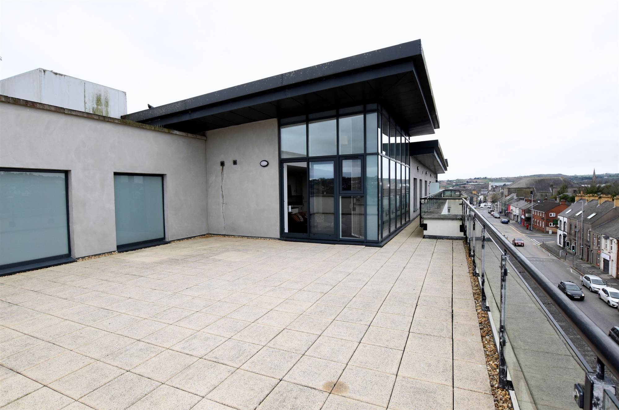 Large balcony in paved patio area.