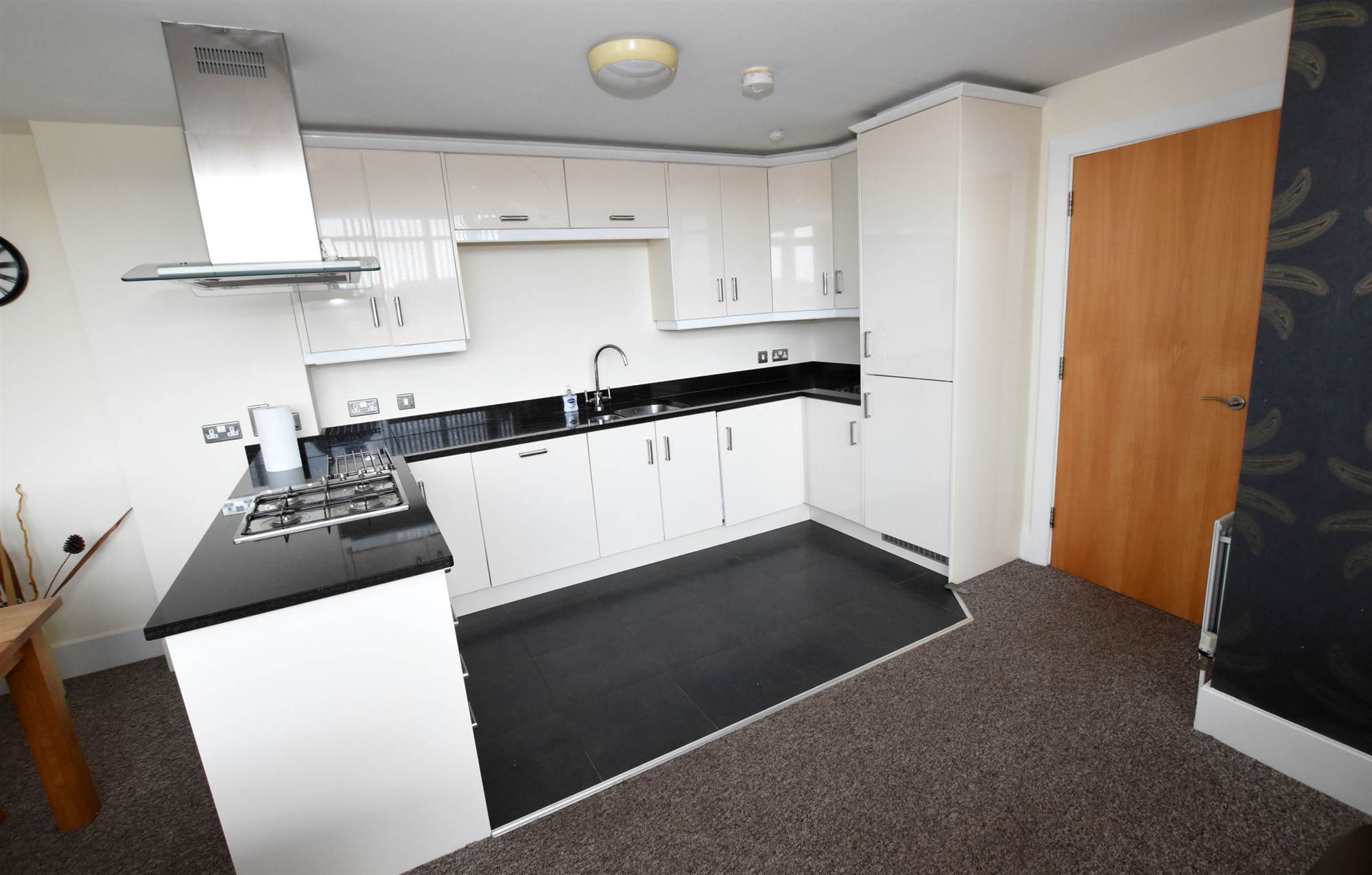 1 ½ Tub single drainer stainless steel sink unit with mixer taps, range of high and low level units, poised granite work tops, built-in oven, four ring hob unit, extractor hood, integrated dishwasher, integrated fridge / freezer, integrated washing machine, ceramic tiled floor to Kitchen area, sliding double glazed patio doors to balcony.