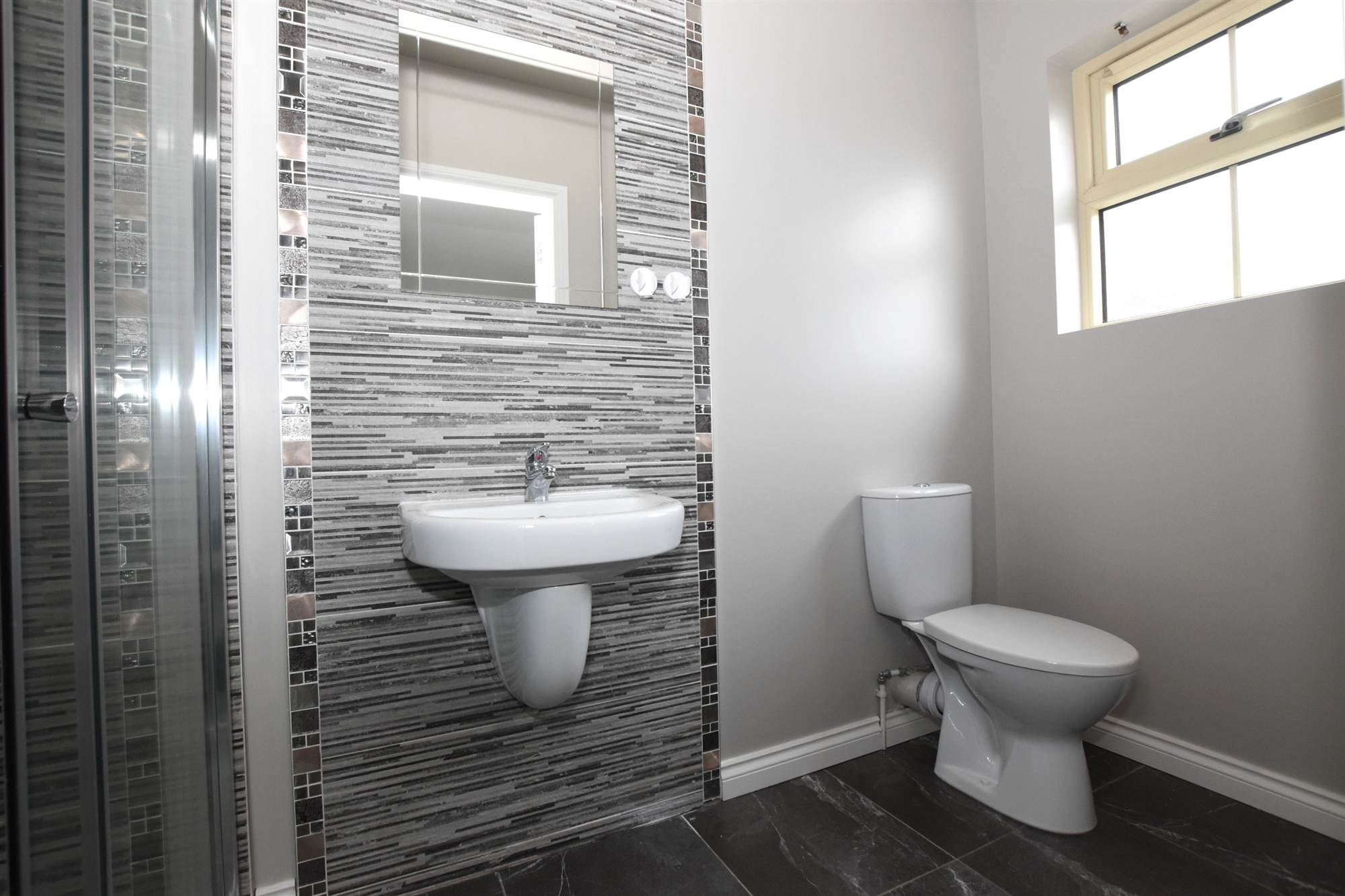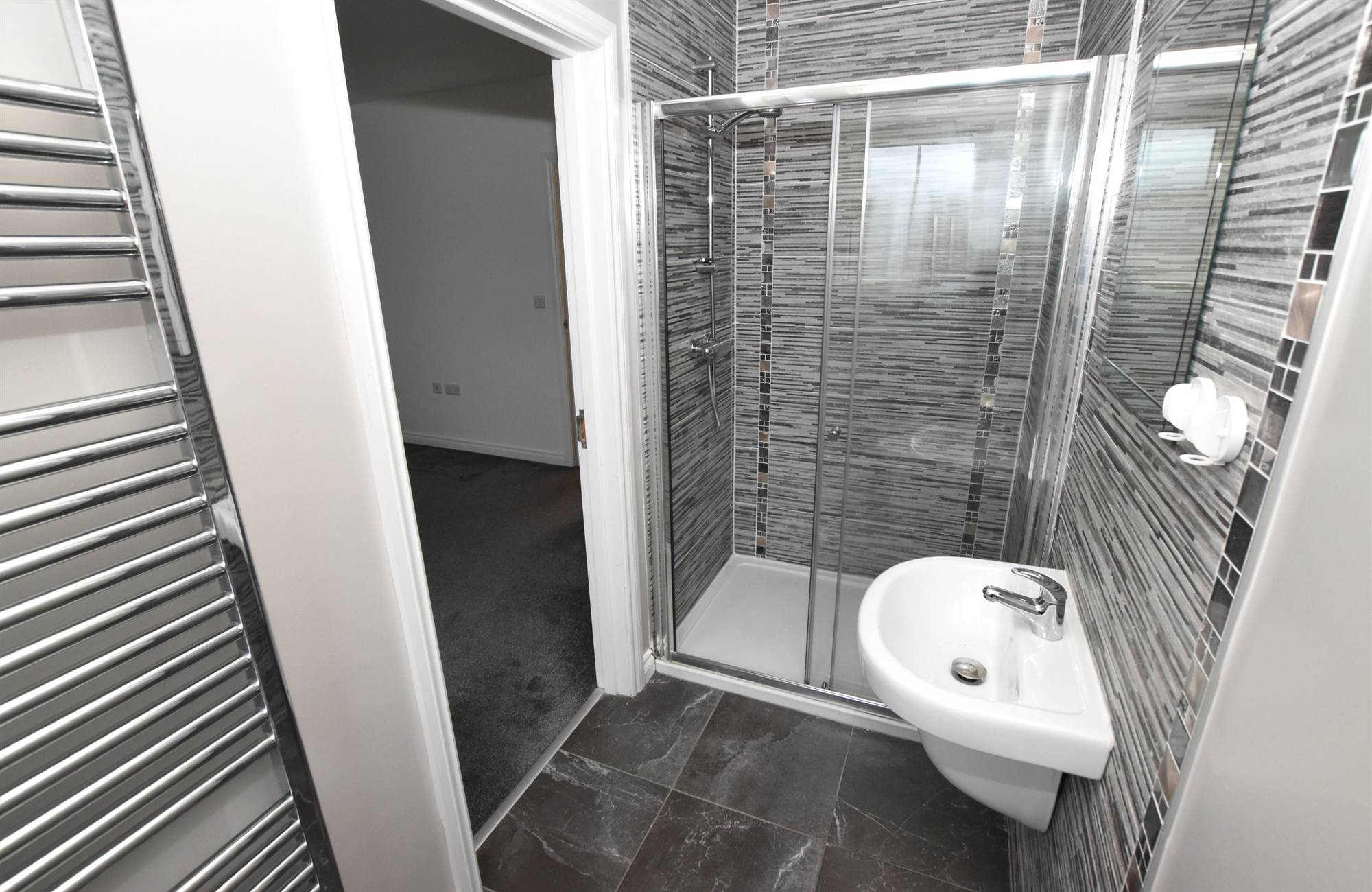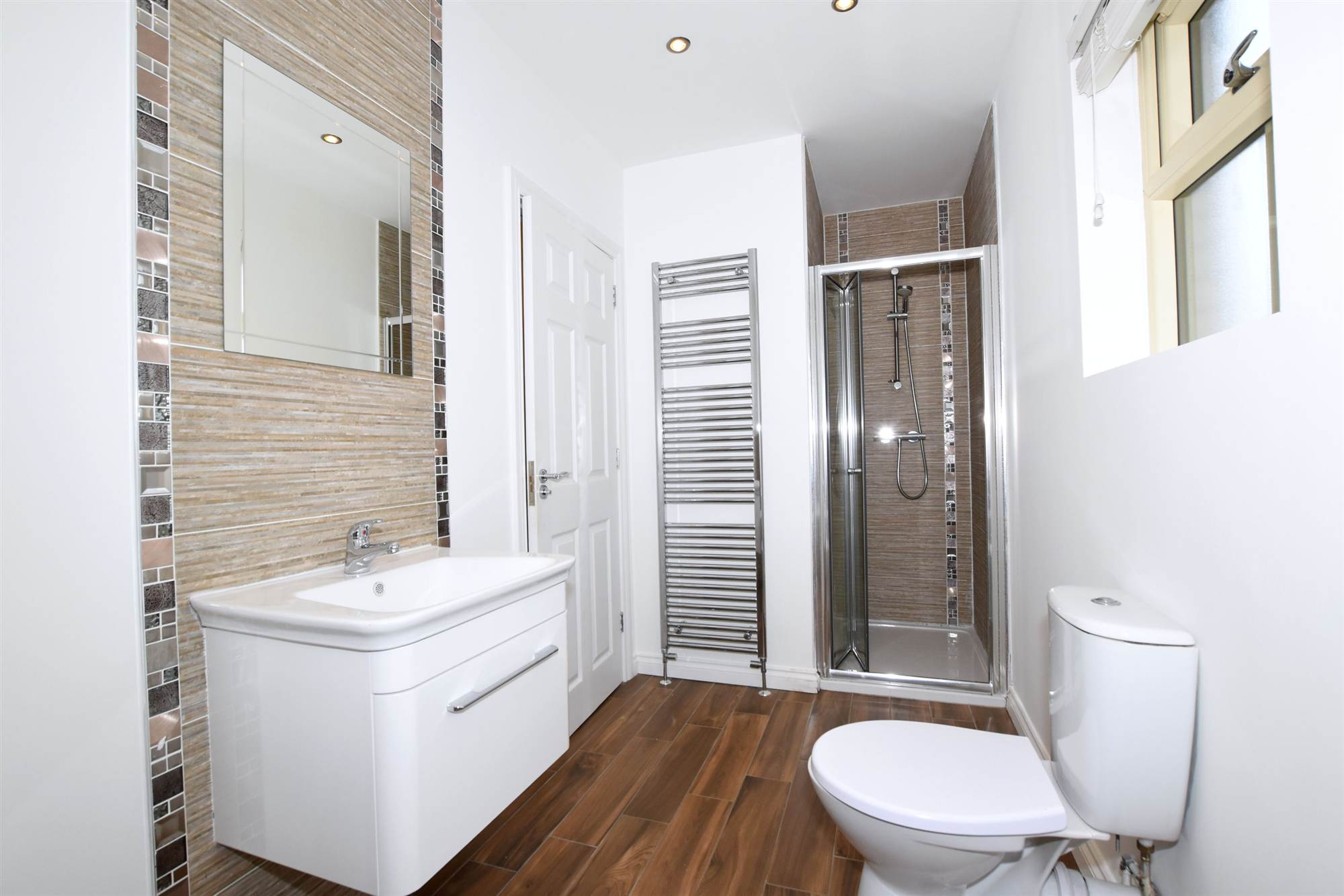 Comprising fully tiled shower cubicle, wash hand basin, low flush WC, wall tiling, ceramic tiled floor, heated chrome towel rail.
