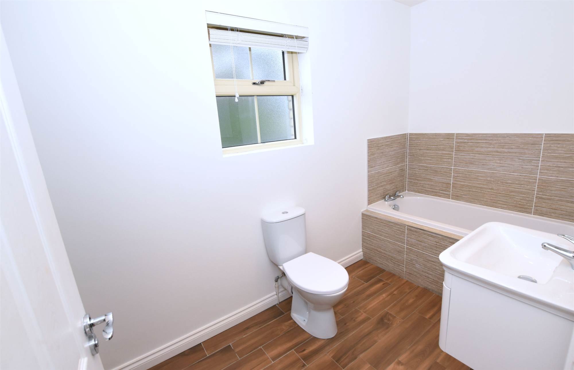 White suite comprising tiled panelled bath, mixer taps, fully tiled shower cubicle, pedestal wash hand basin, low flush WC, wall tiling, ceramic tiled floor, recessed spotlighting, heated chrome towel rail.