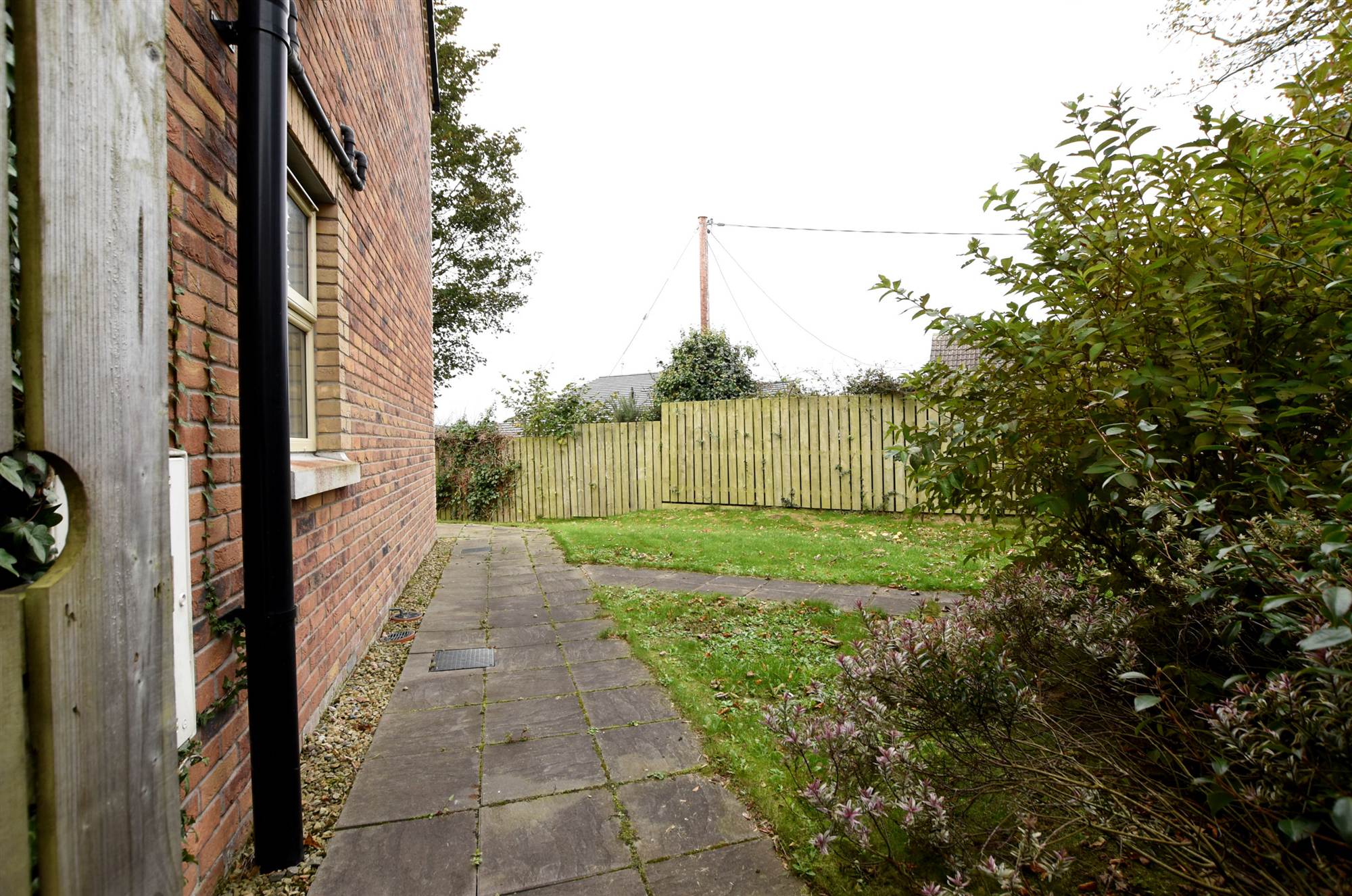 To front in lawns and rear enclosed in lawns, trees, paved patio area and fencing.