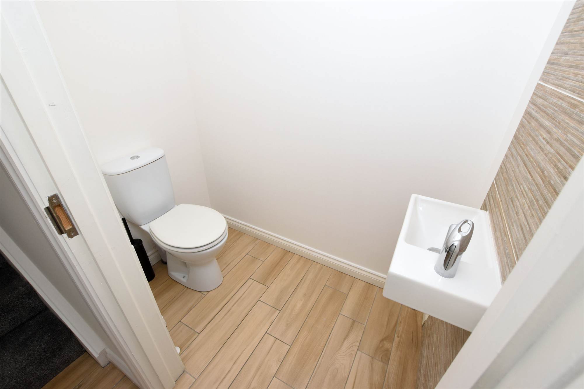 White suite comprising low flush WC, wash hand basin, extractor fan, ceramic tiled floor.