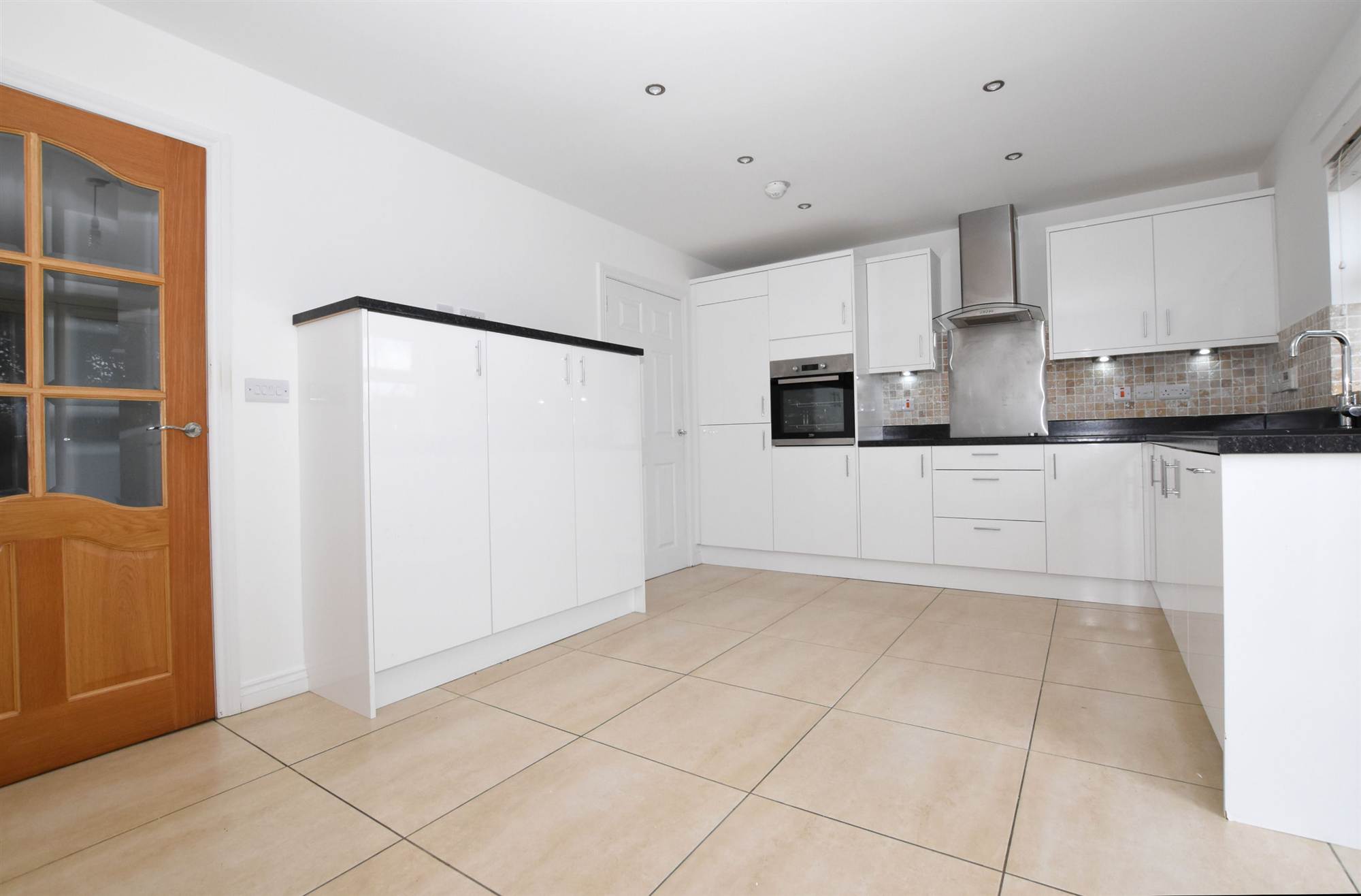 1½ tub single drainer sink unit, mixer taps, range of high and low level units, formica round edged work surfaces, built in oven, four ring hob unit, extractor hood, integrated fridge/freezer, integrated dishwasher, recessed spotlighting, wall tiling, ceramic tiled floor, Upvc double glazed french doors to rear.