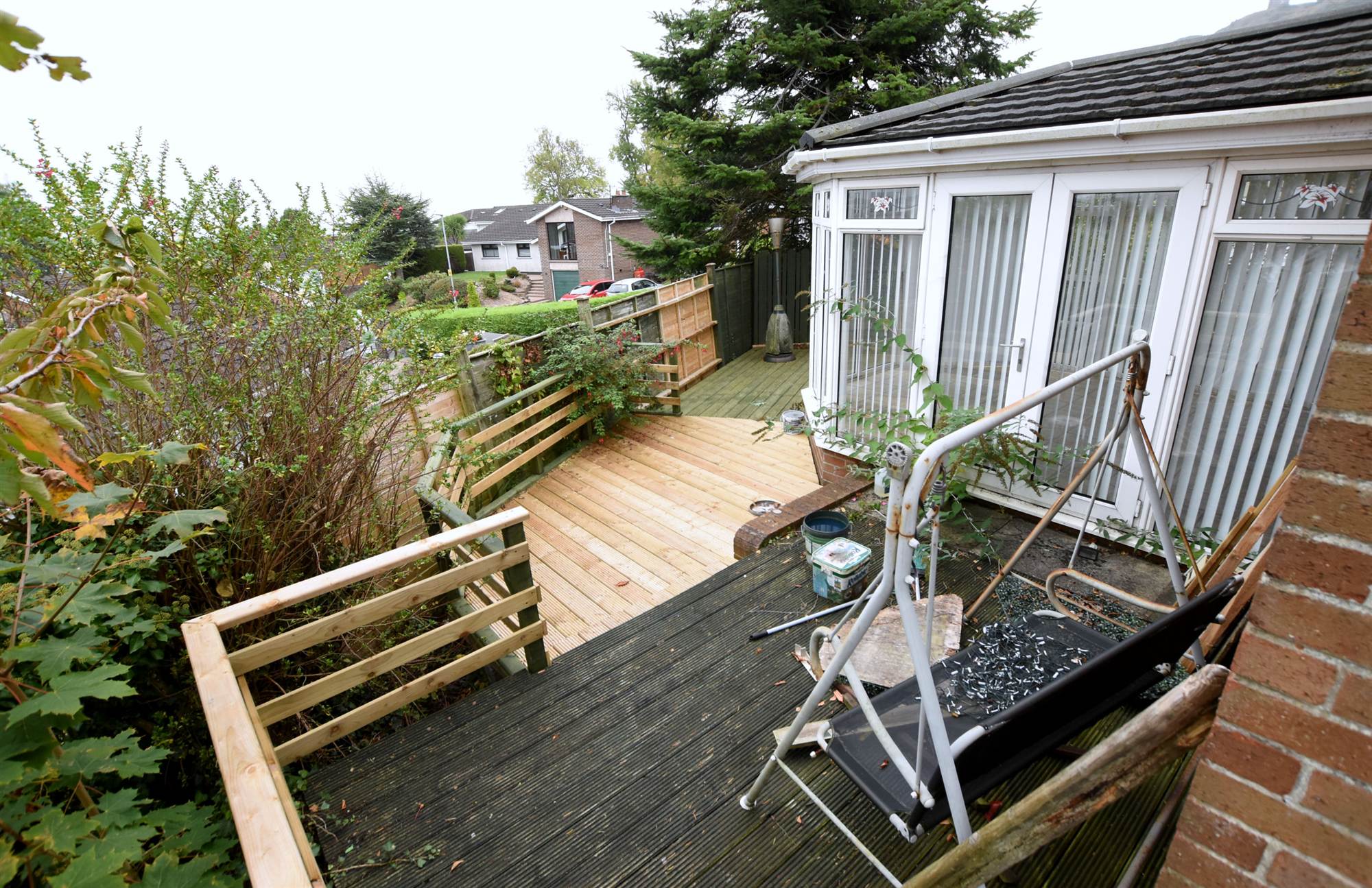 Gardens to front in lawns, trees, bushes and rear in paved patio area, timber deck area and hedges.
