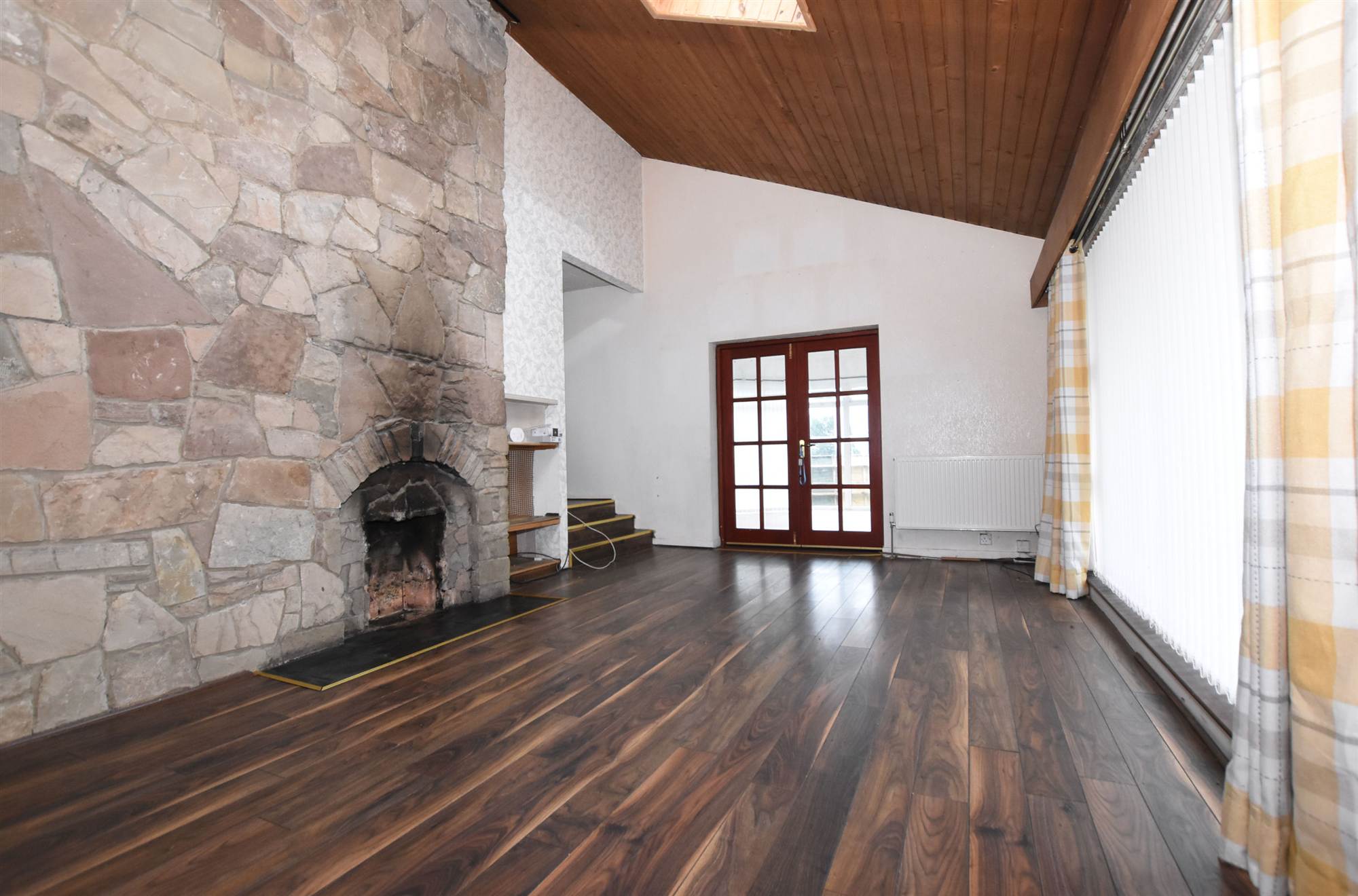 Feature Scrabo Stone fireplace, slate hearth, polished laminate floor, glazed double doors to:.
