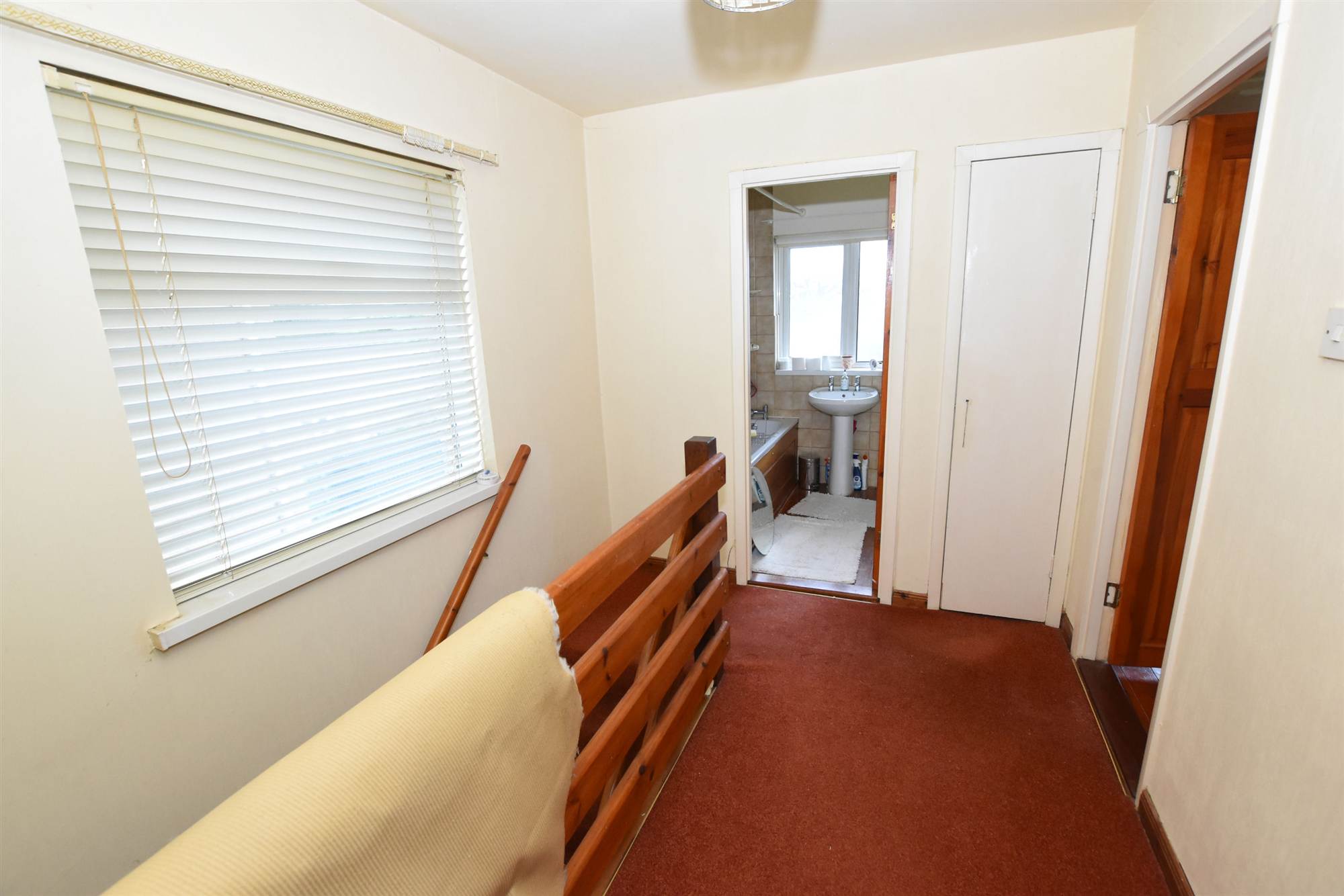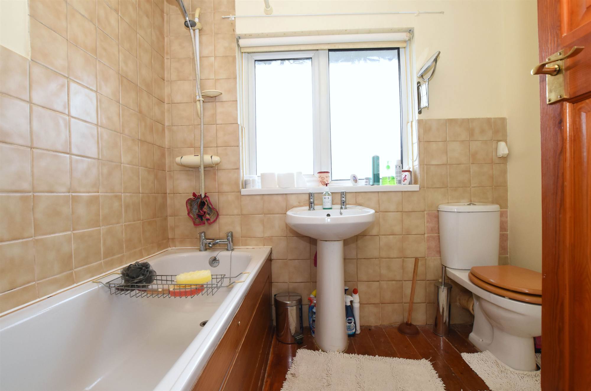 pedestal wash hand basin, low flush WC, wall tiling.