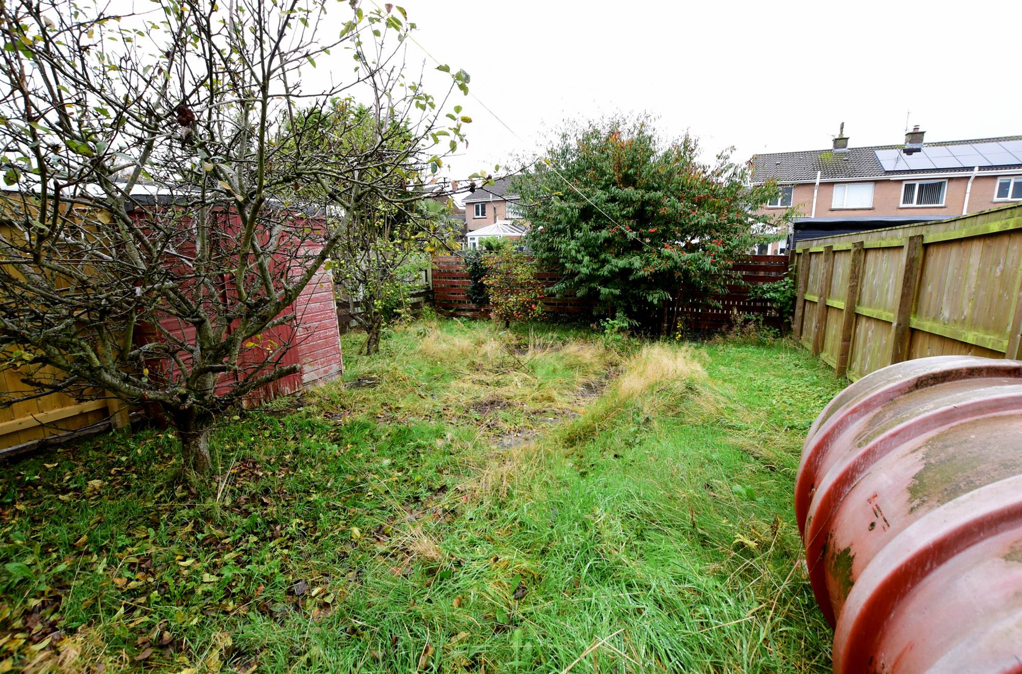 To front in shrubs and bushes and enclosed rear in lawns, apple trees and fencing.