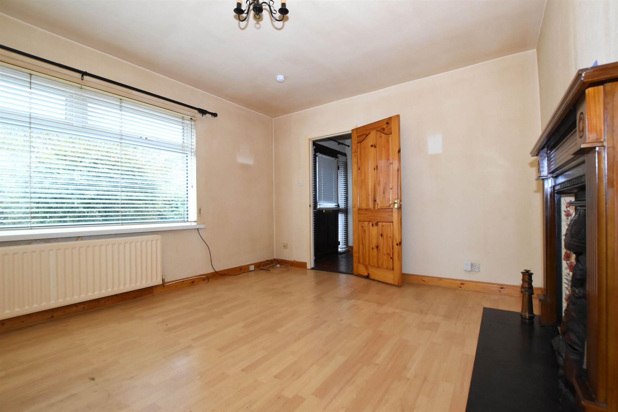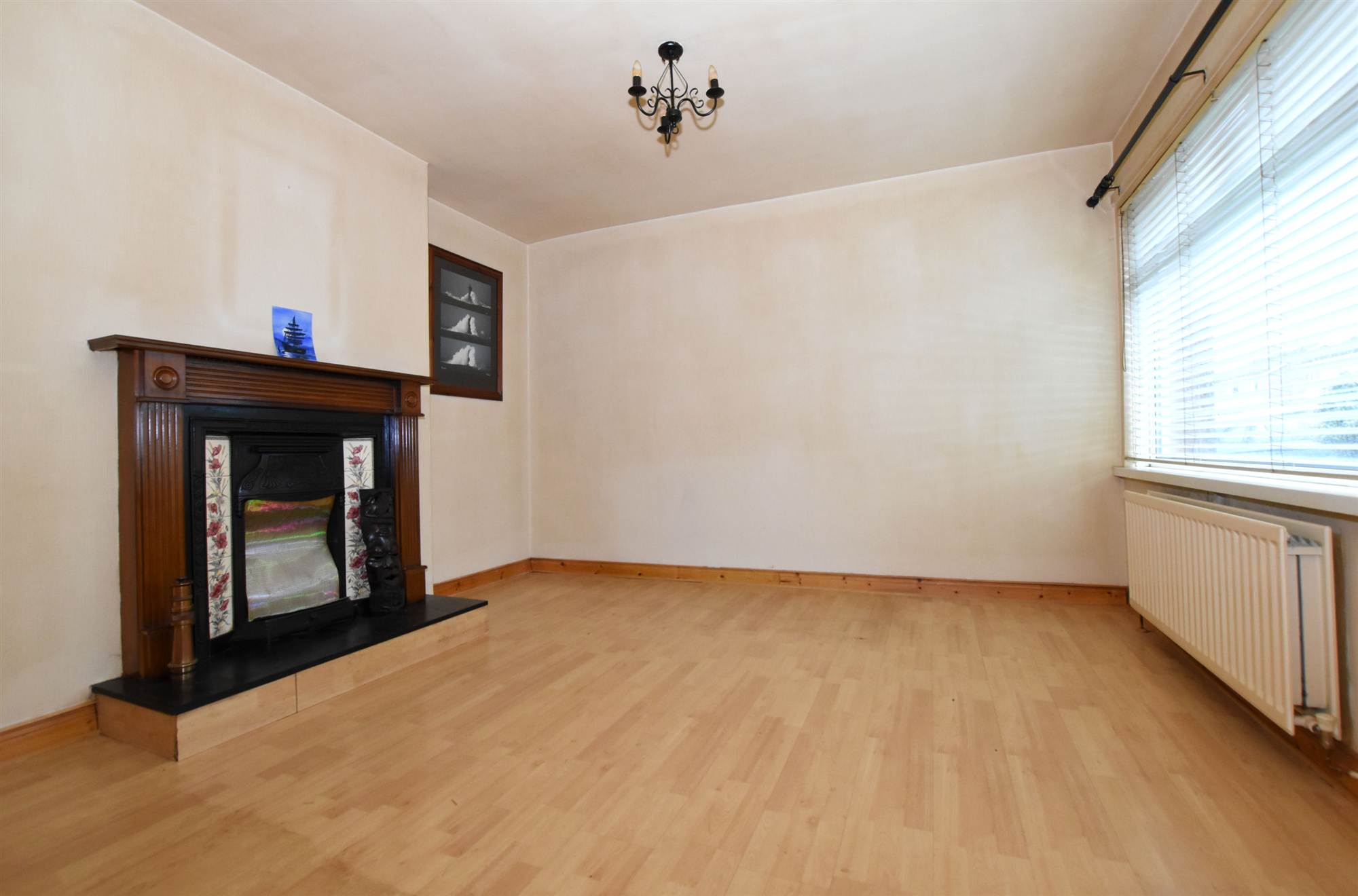 Carved wood surround, cast iron and picture tiled inset, slate hearth, polished laminate floor.