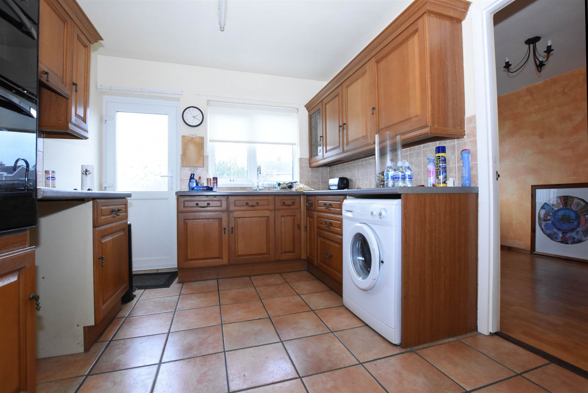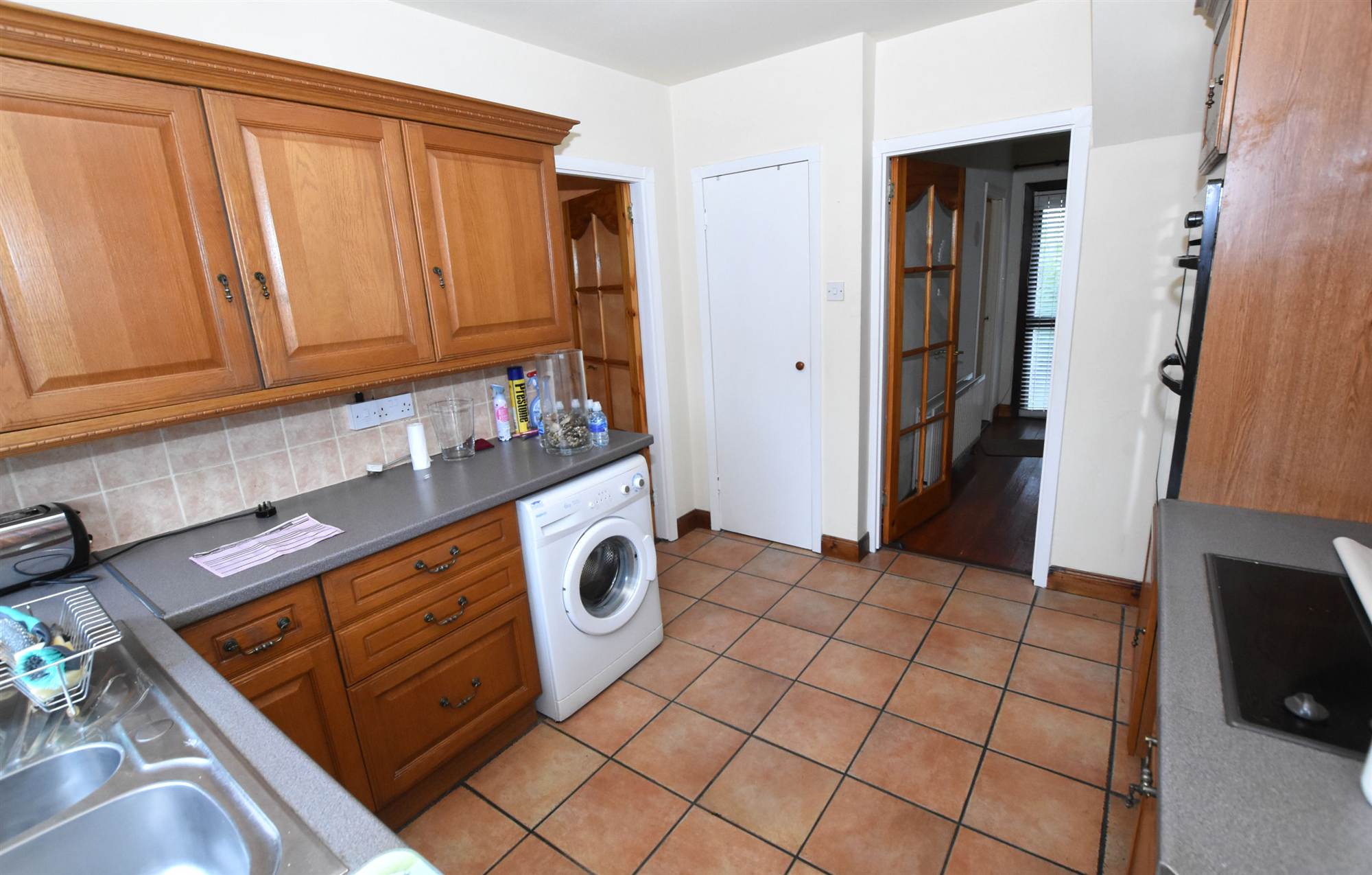 1 ½ Tub single drainer stainless steel sink unit with mixer taps, range of high and low level units, formica round edged work surfaces, built-in double oven, four ring hob unit, extractor fan, wall tiling, ceramic tiled floor, plumbed for washing