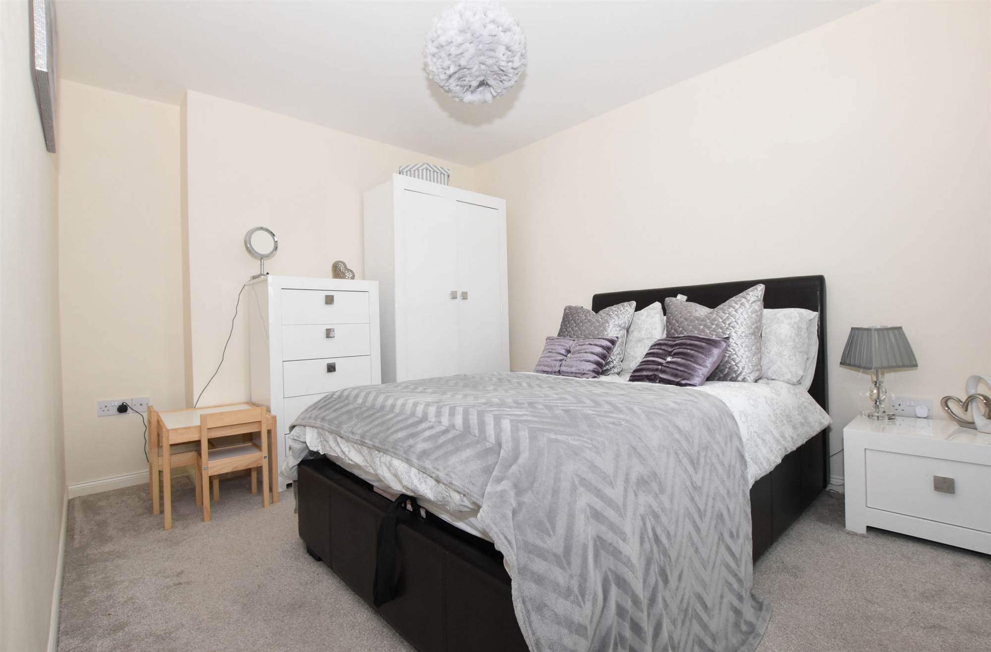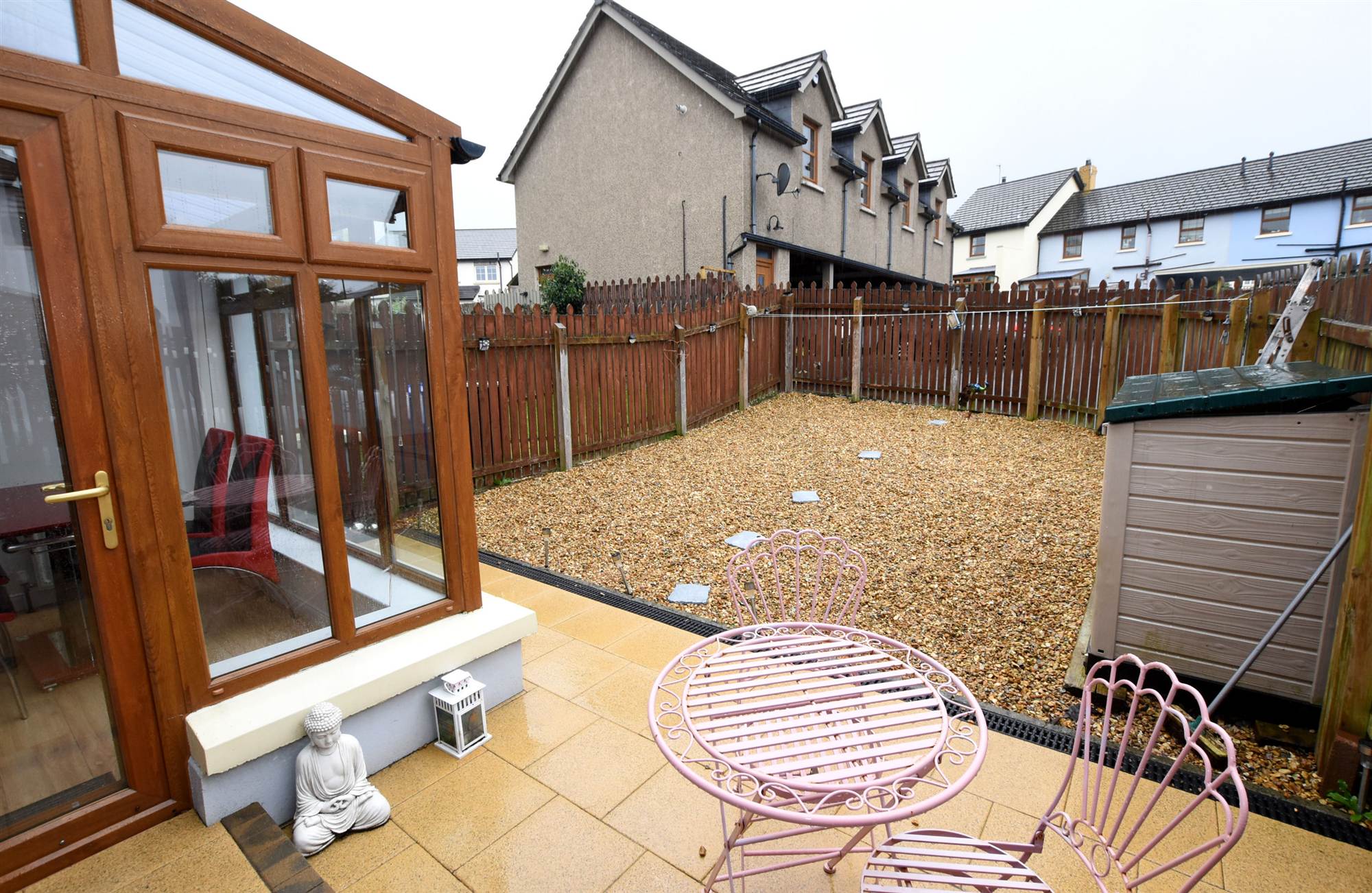 To front in lawns and enclosed rear in paved patio area, pebbled area and fencing.
