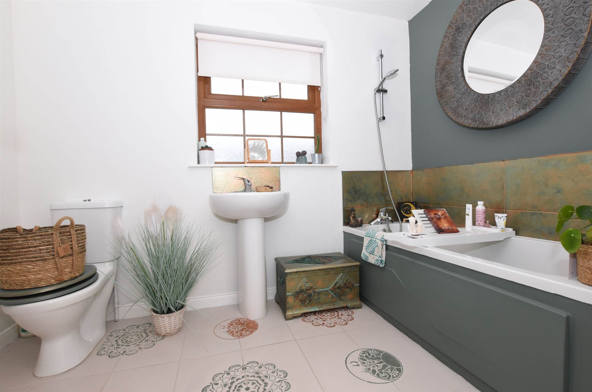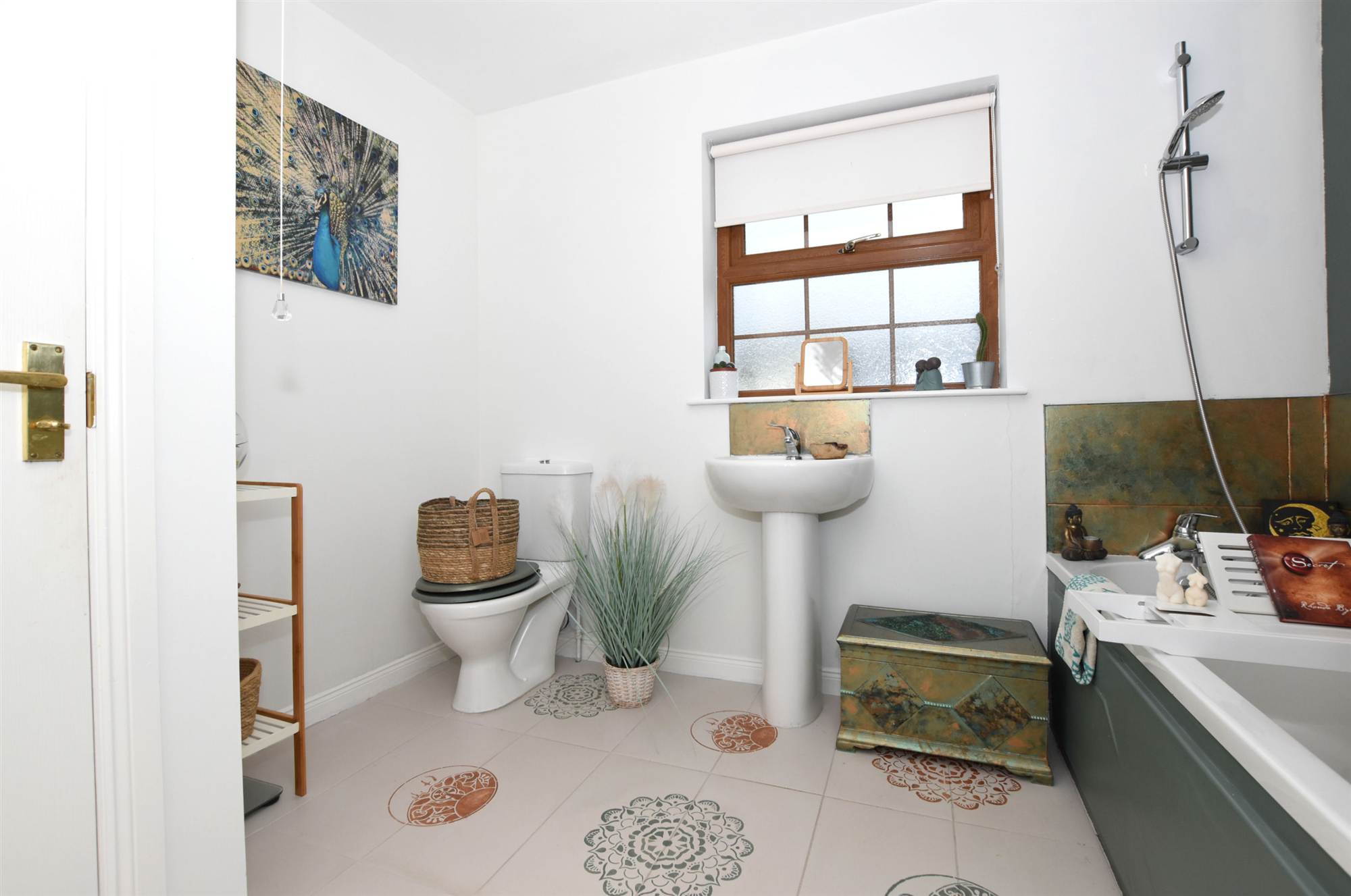 controlled shower unit, pedestal wash hand basin, low flush WC, recessed spot lighting.