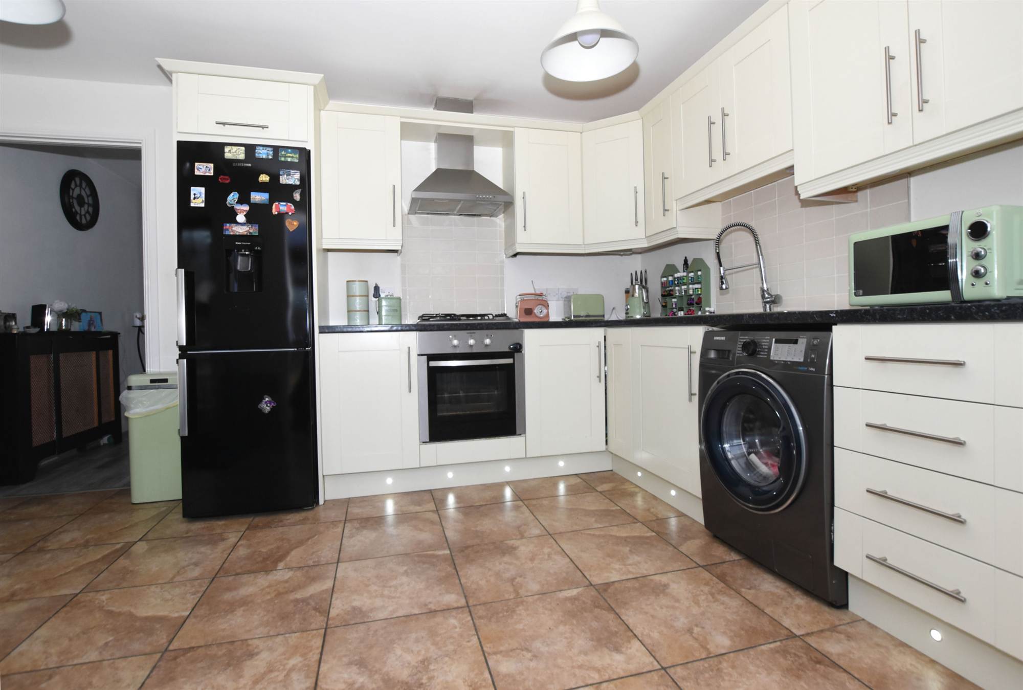 Deluxe fitted kitchen with built-in oven, hob and extractor hood.