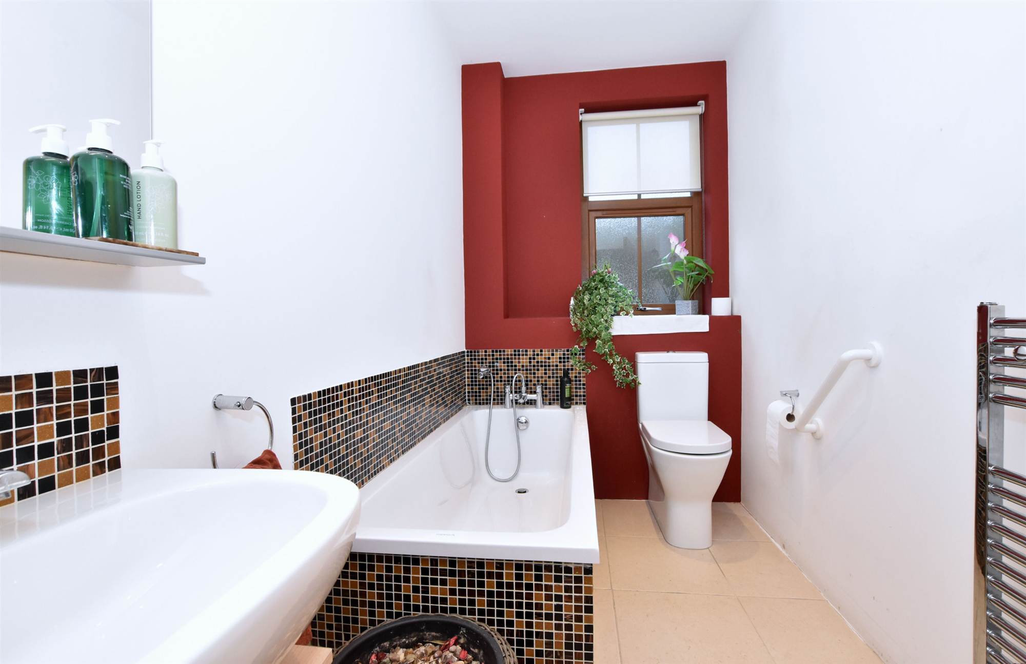 mixer taps, low flush WC, wall tiling, ceramic tiled floor.