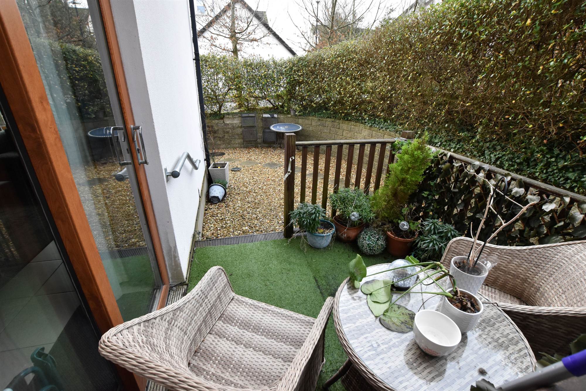 Communal gardens to front, side and rear in shrubs, bushes and timber deck area.