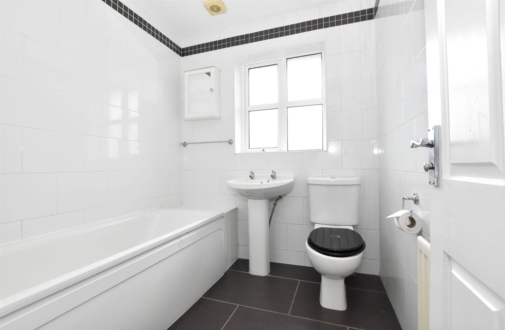 White suite comprising panelled bath, triton thermostatically controlled shower unit over bath, pedestal wash hand basin, low flush WC, wall tiling, ceramic tiled floor.