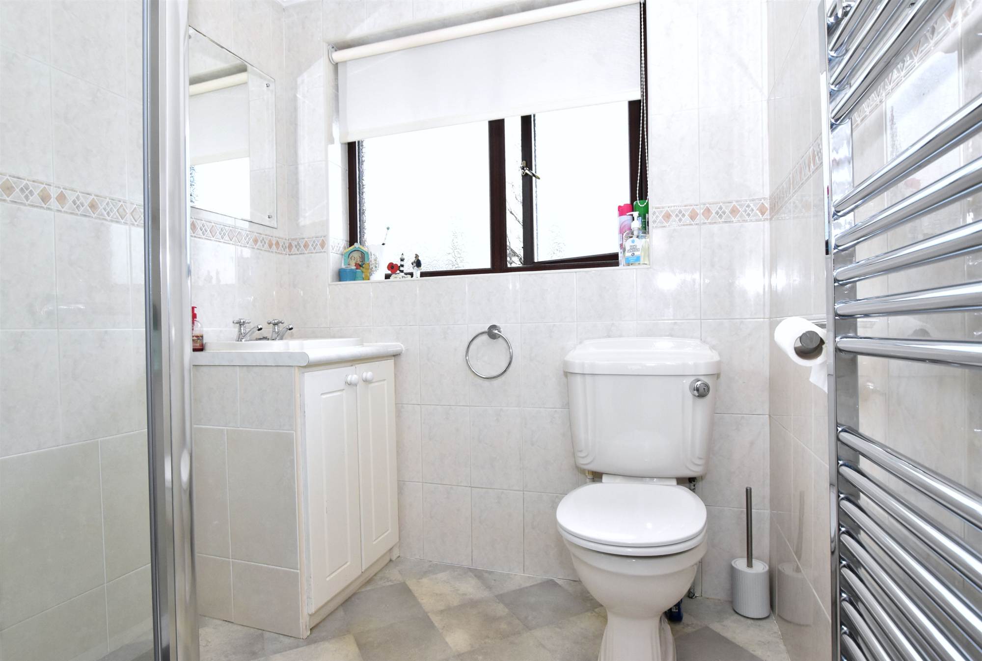 controlled shower unit, vanity unit, low flush WC, wall tiling, heated chrome towel rail, extractor fan.