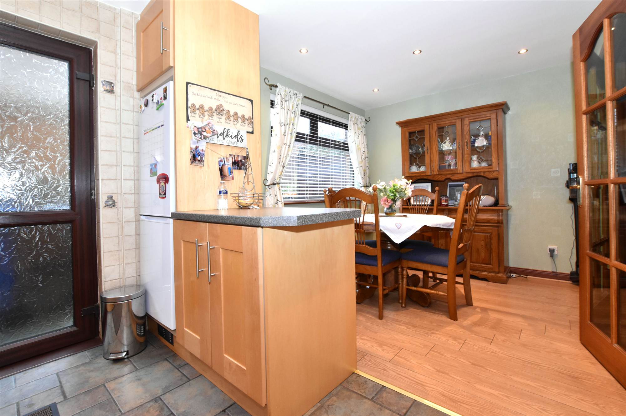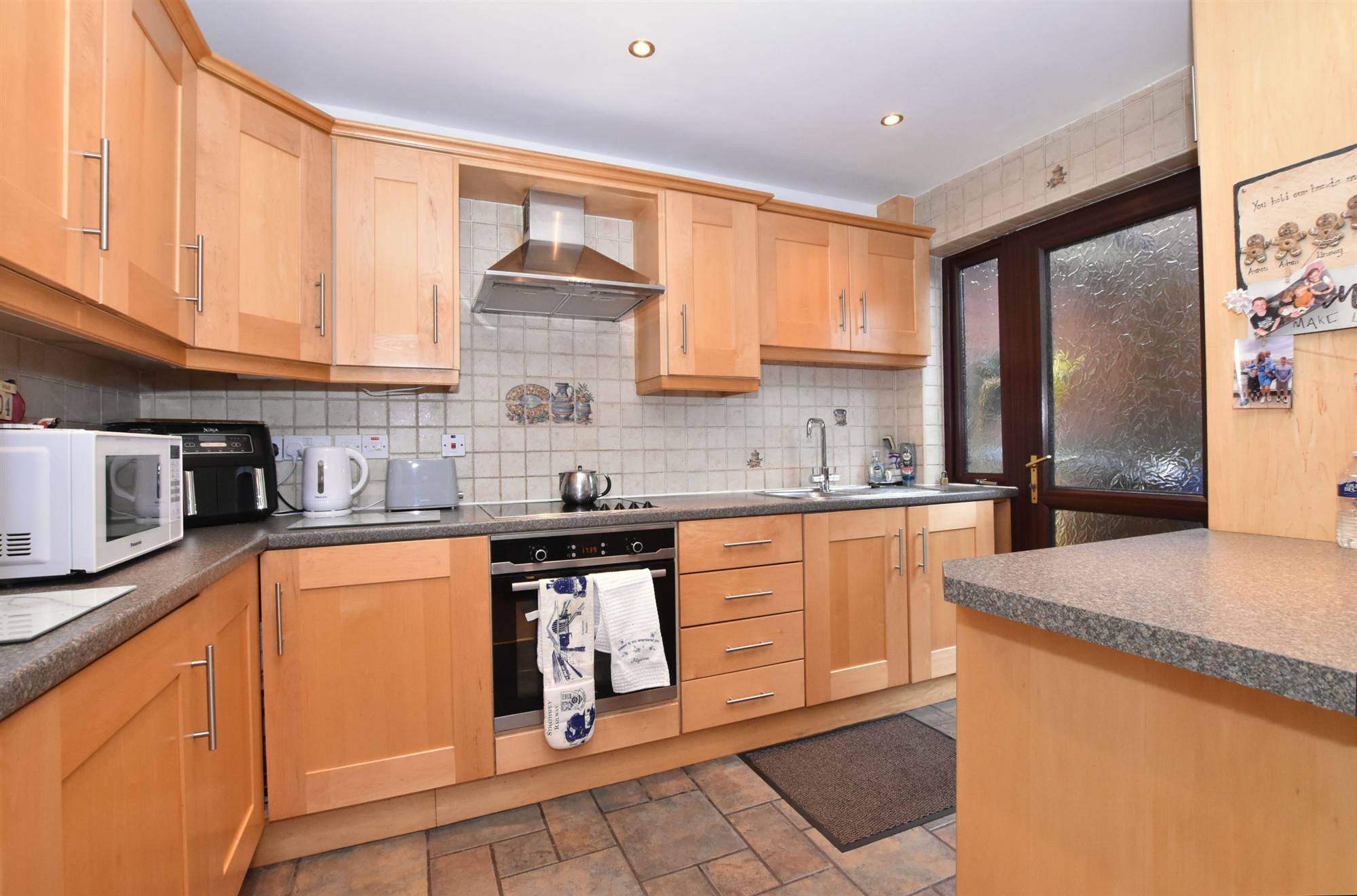 Single drainer stainless steel sink unit with mixer taps, range of high and low level units, formica round edged work surfaces, built-in oven, four ring hob unit, extractor hood, wall tiling, ceramic tiled floor to Kitchen area, recessed spotlighting.