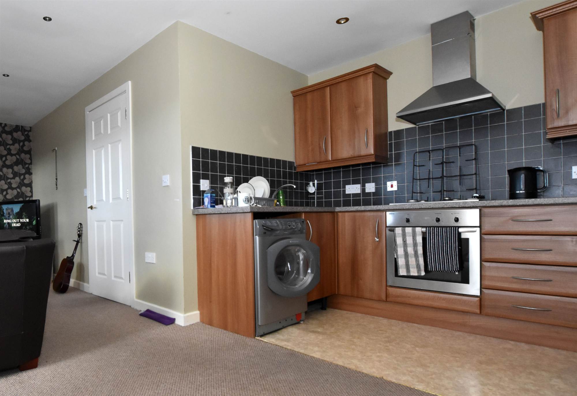 Fitted kitchen with built-in oven, hob and extractor hood.
